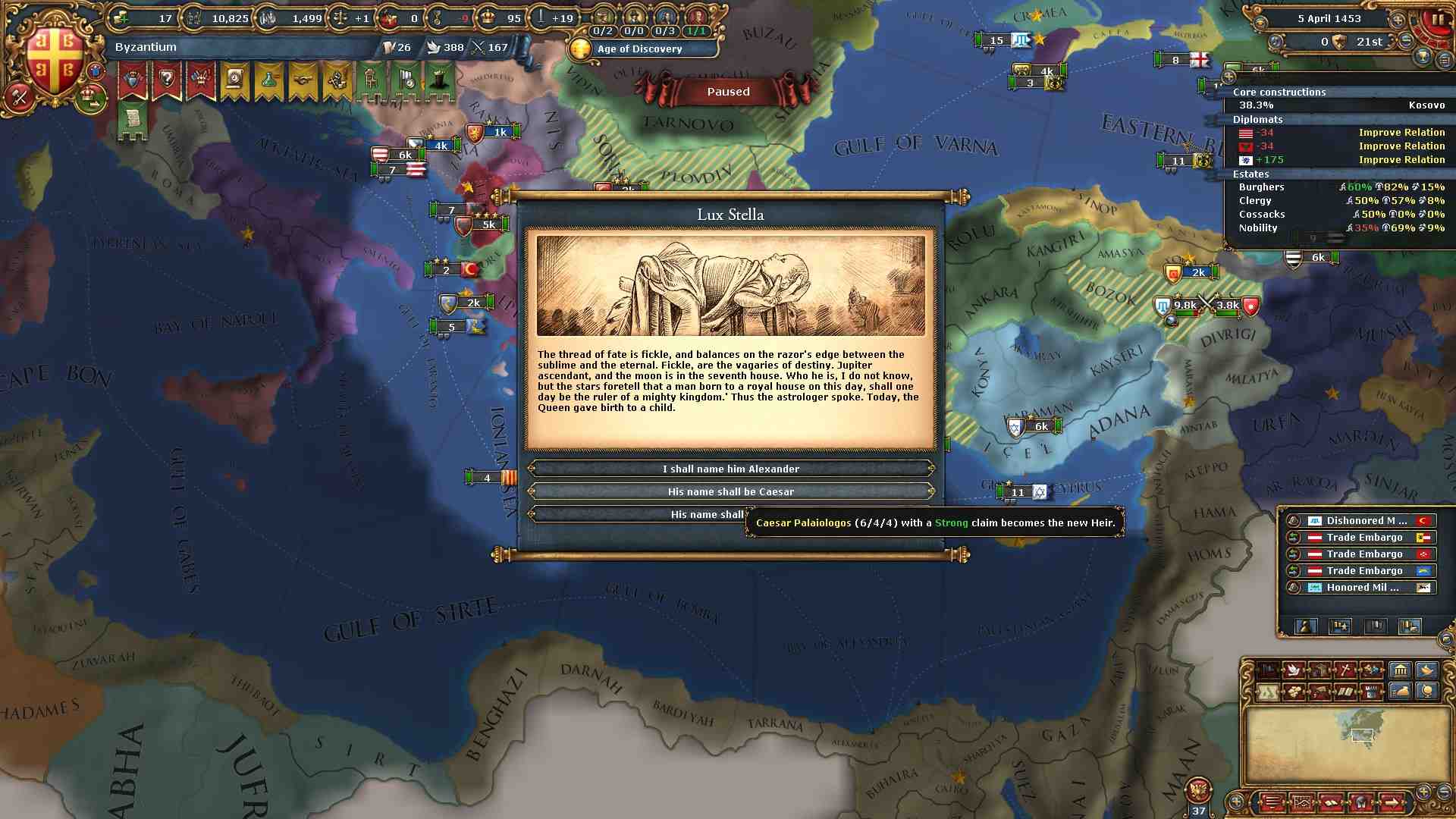 コンスタンチノープルは布告で要塞防御を上げておきます(Defensive Edict)。