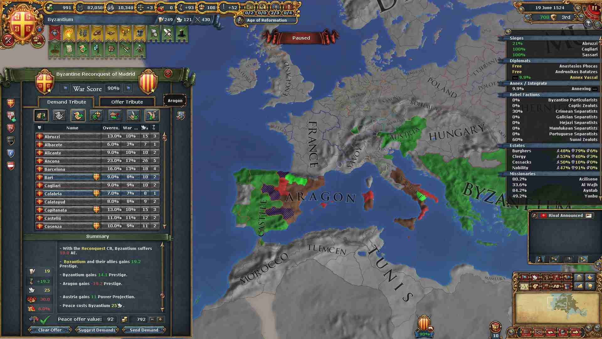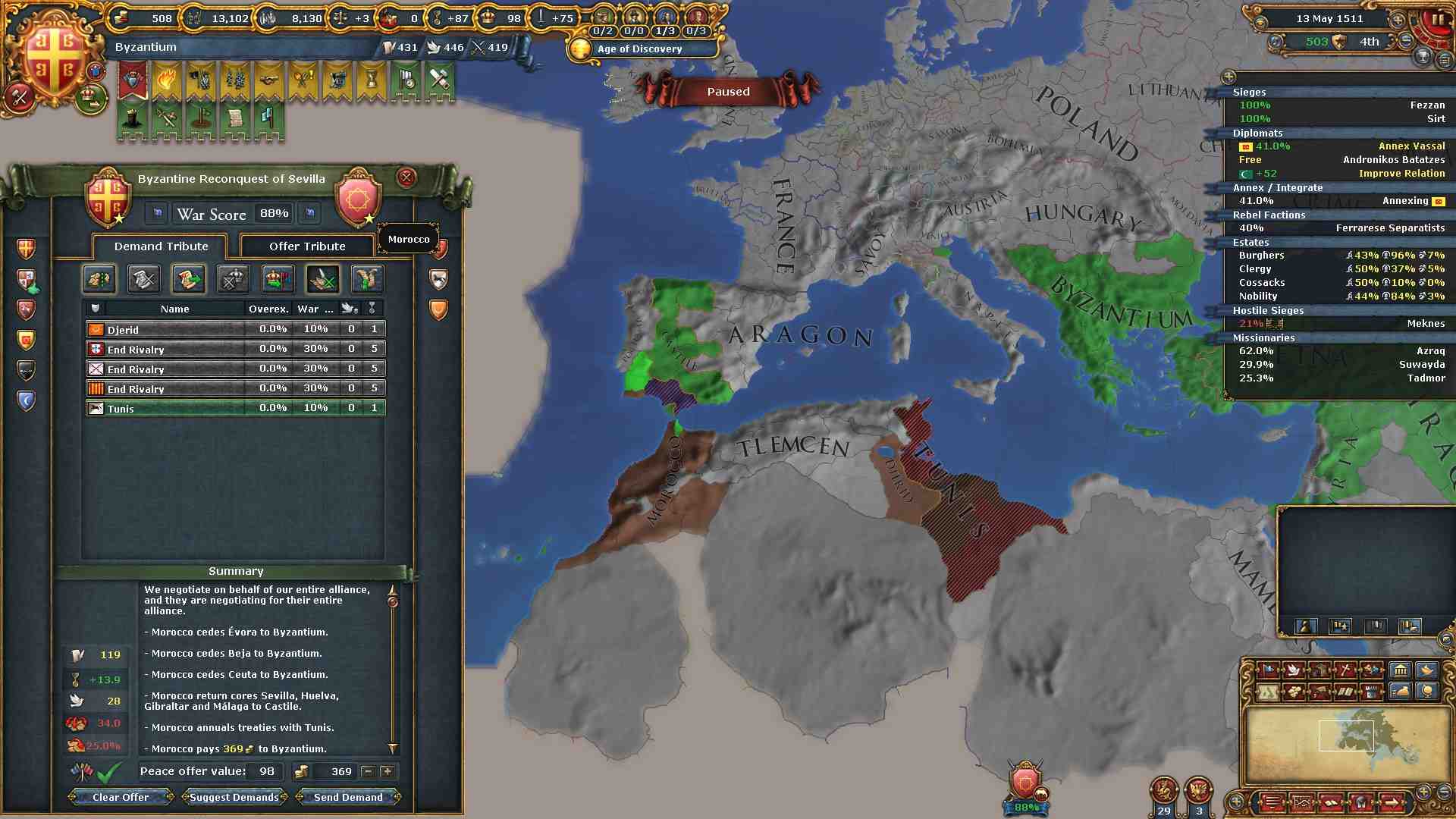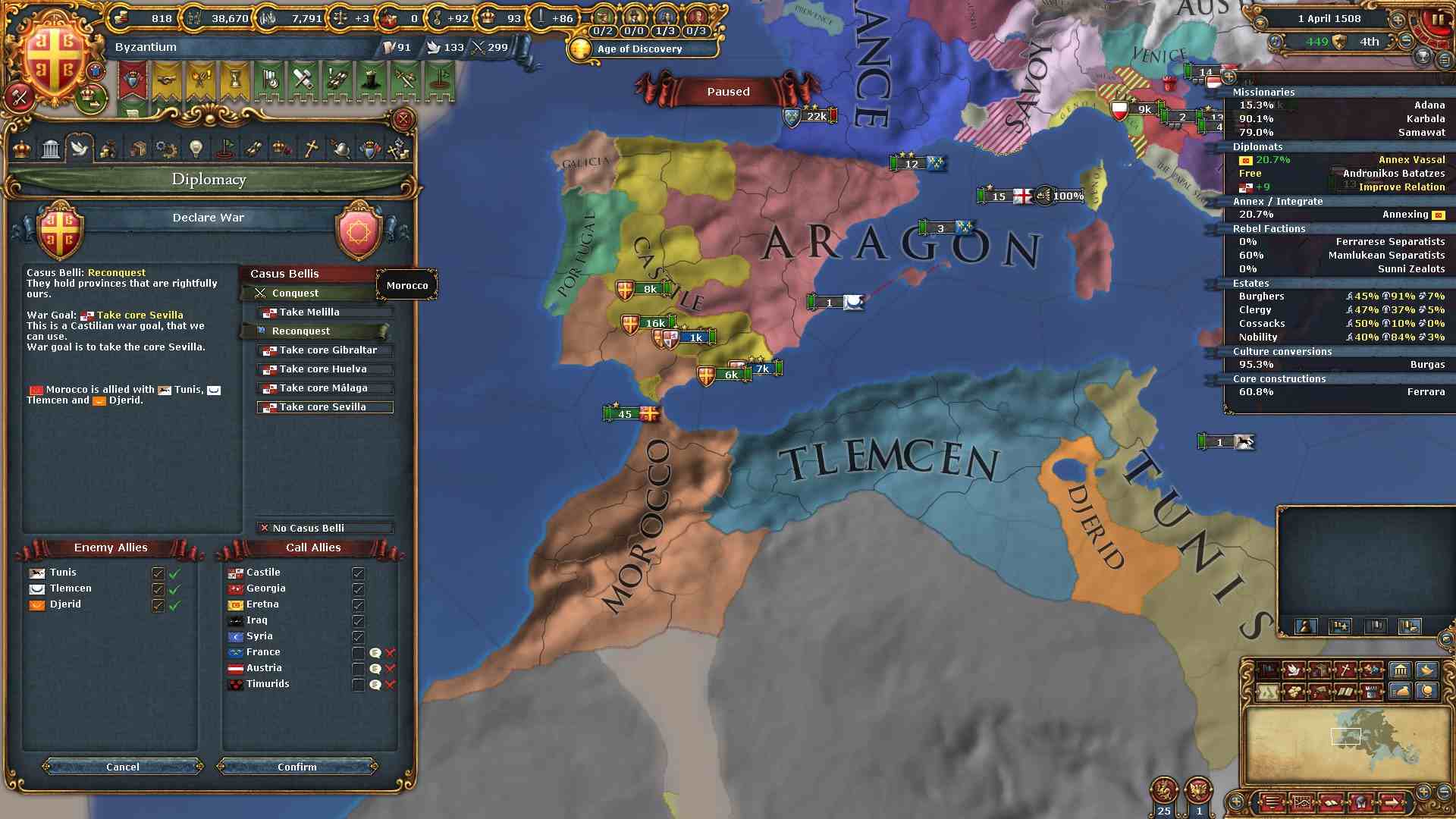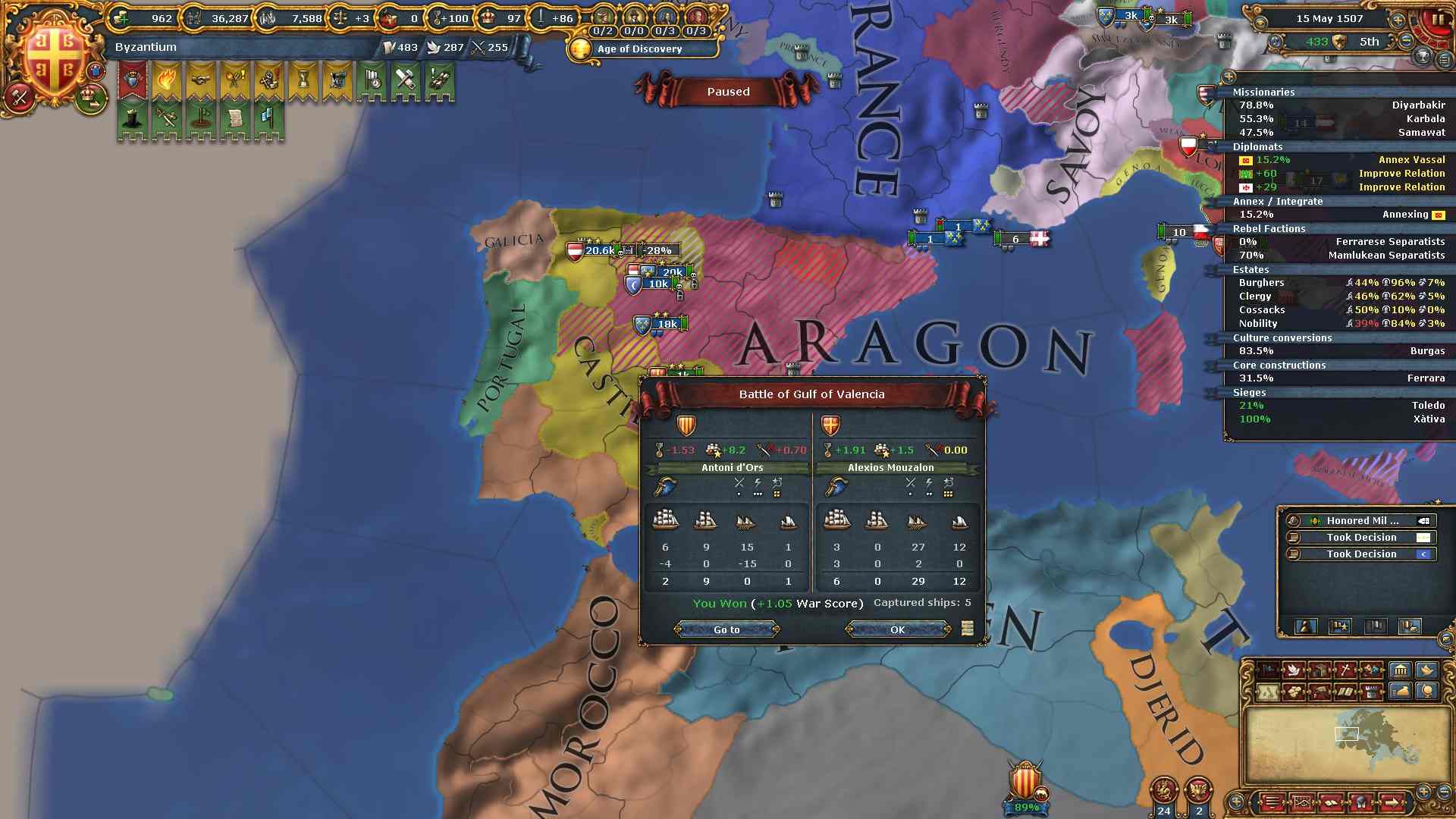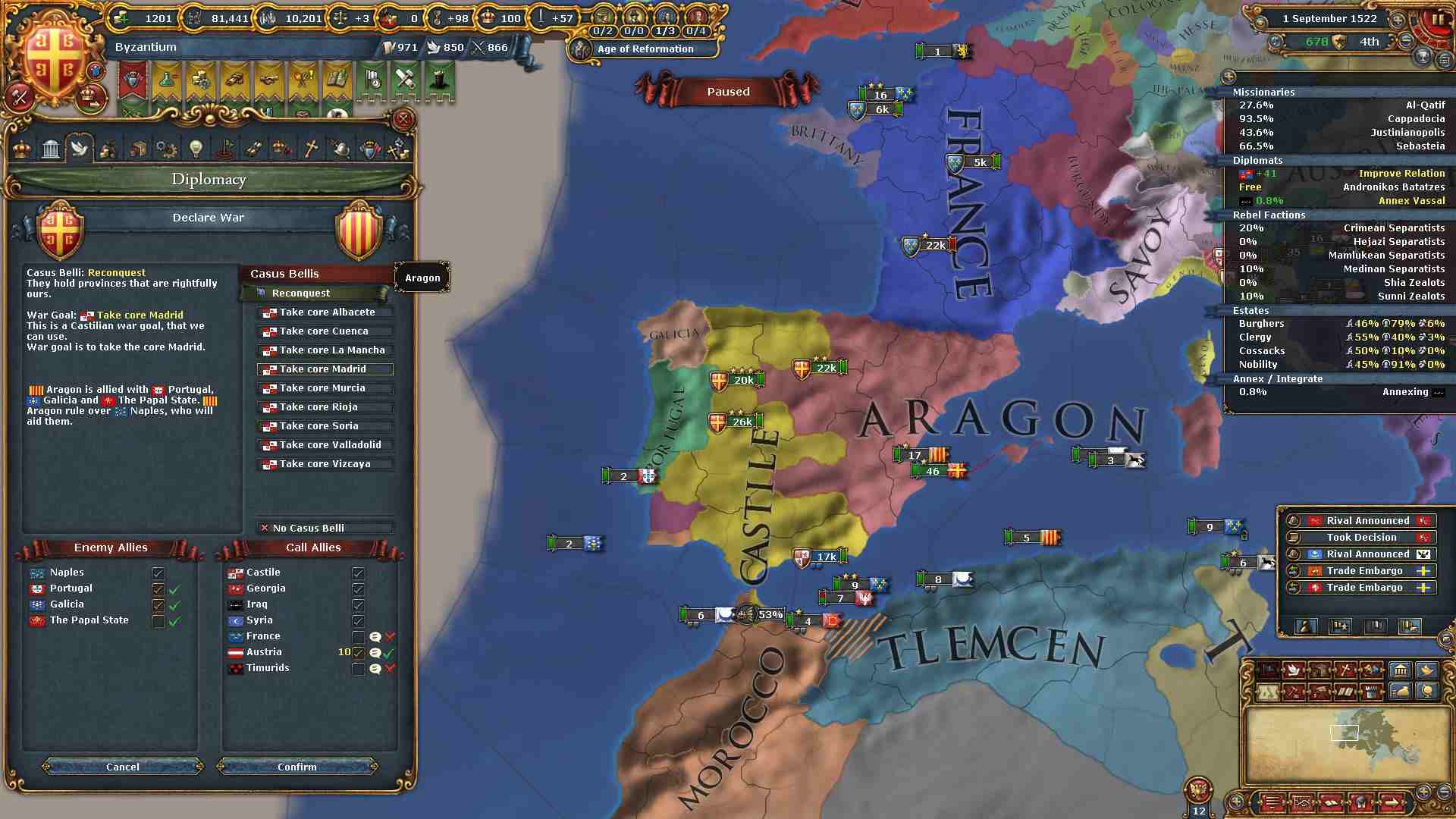 AE対策の為にキリスト教圏への侵攻に関しては、当分の間アラゴン、ポルトガルだけに絞ります。