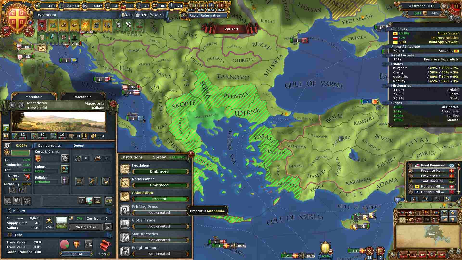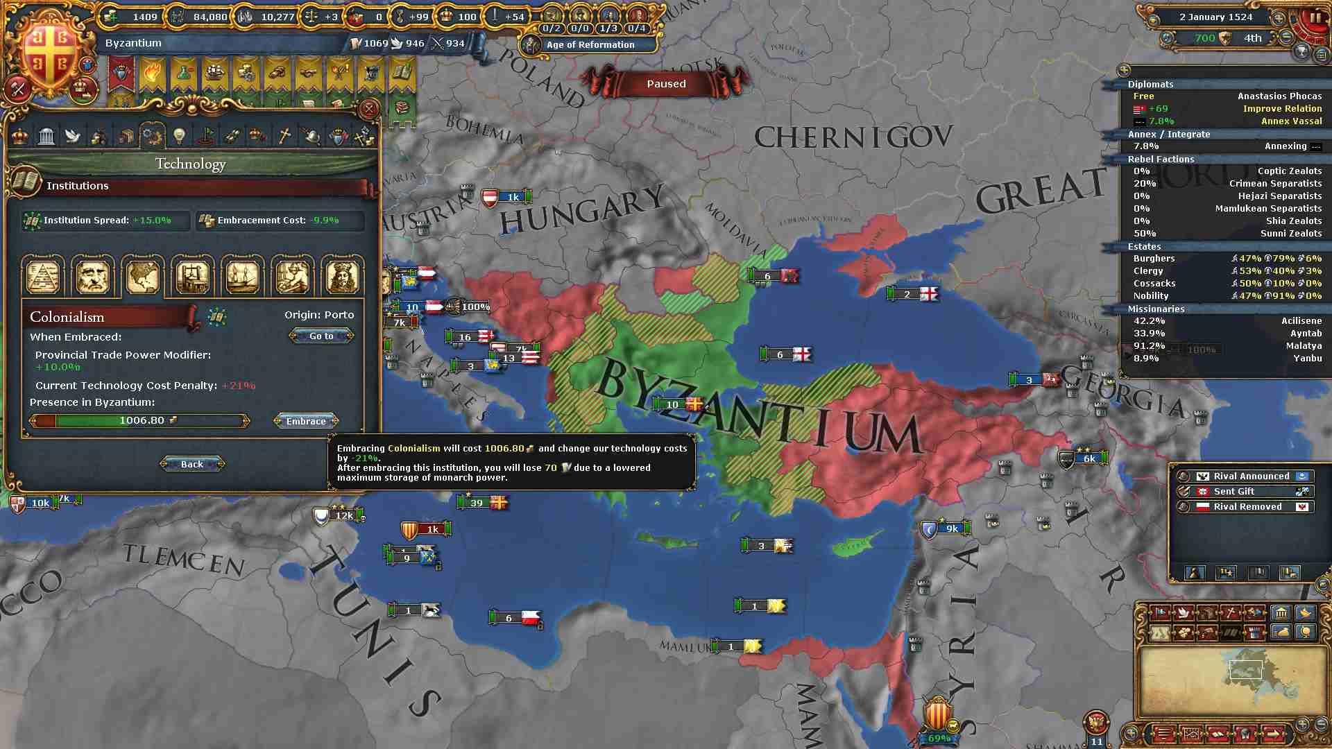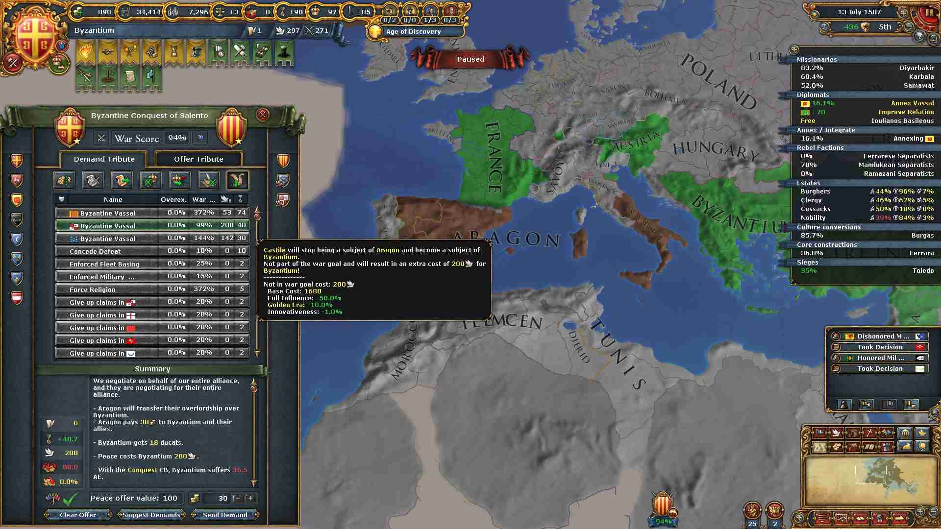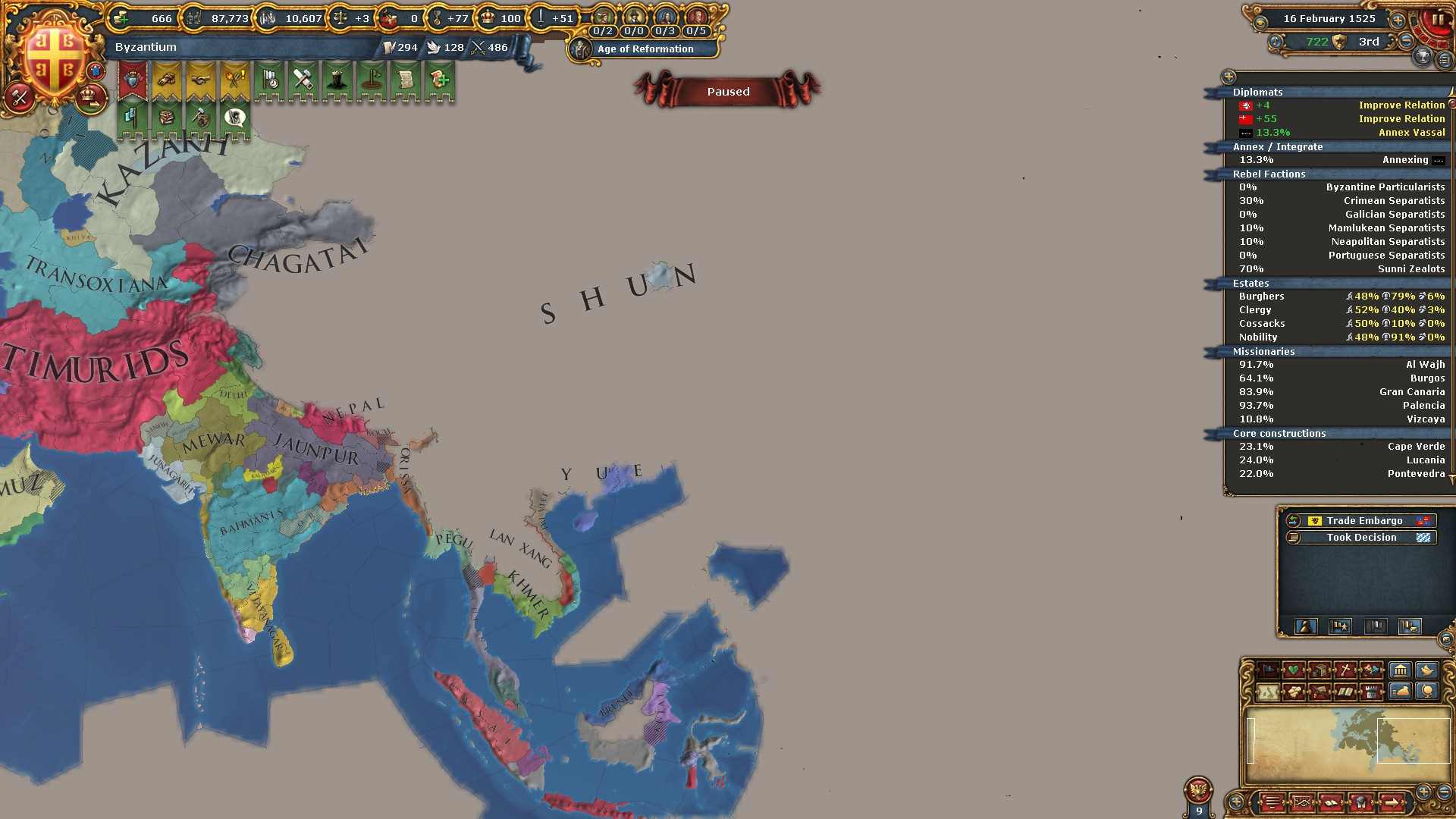 ミッションの外交併合コスト減少の効果も使い、属国エレトナの外交併合が終わりました。