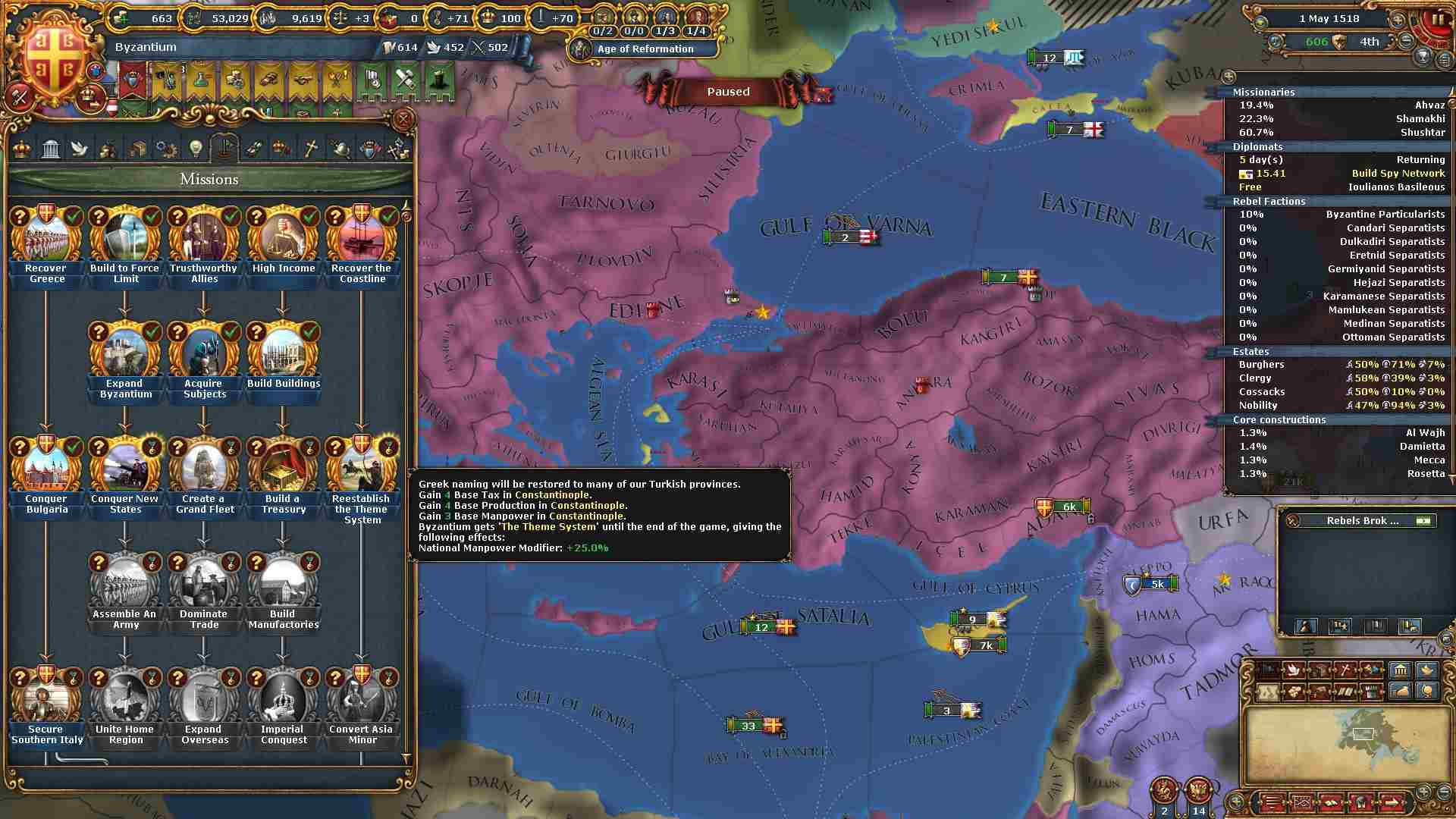 ミッションに必要な州が揃ったので「テマ制」の効果を発動できました。