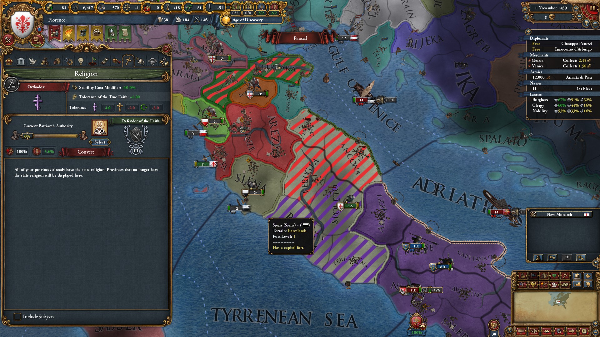 Florenceはイタリア中部の3プロビ国家.周辺のThe Papal StateやMilanなどの中堅国よりは弱いが,食べやすそうな1~2プロビ国家と多く隣接している.
