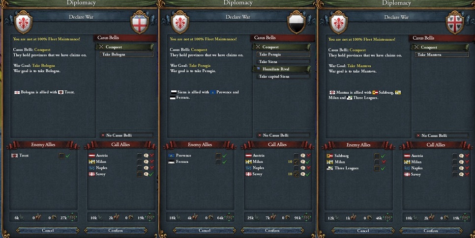 同盟国のFavorを見つつ,Bologna・Siena・Mantuaに立て続けに宣戦.