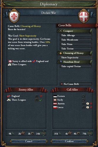 Savoyに宣戦布告.同盟のEnglandはFranceに殴られており,参戦できない様子.