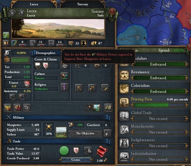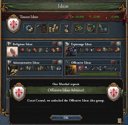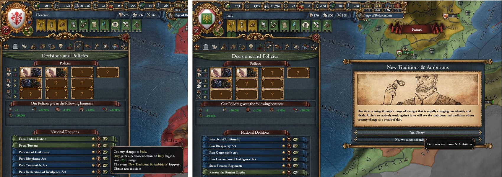1575年,政府改革Tier8から有権者:市民を選択して陸軍士気+10 %を得る.イタリア国家には貴重な軍質補正だ.