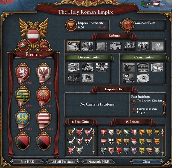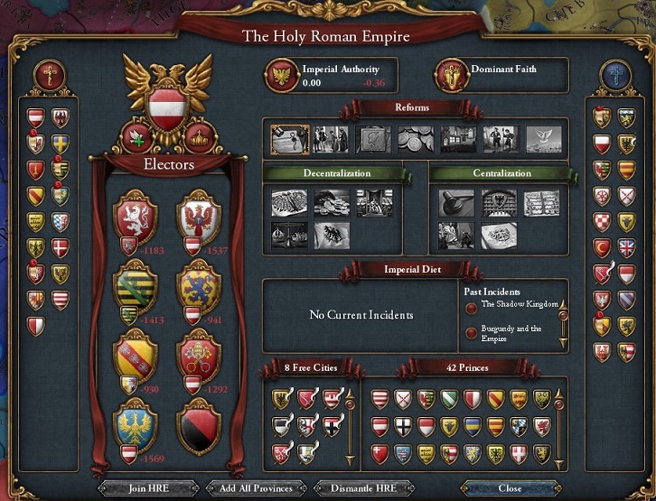軍質が上がったり,Governing Capacity +250とテリトリー自治度下限-10 %を両方得られたり(君主制だと択一),政府改革を全部開けられるなら共和制にも独自の強みがありそうなのだが,そこに至るまでが面倒で嫌になる.