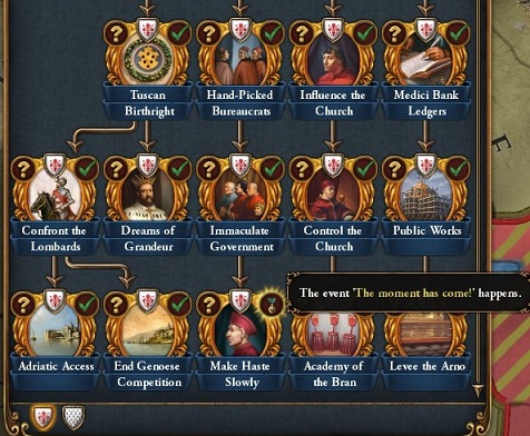 Ver. 1.29まではTuscany変態ディシジョンを踏むと君主制になったが,1.30ではディシジョンによる政体移行効果が消滅し,代わりにこうしてミッションで移行するようになったらしい.