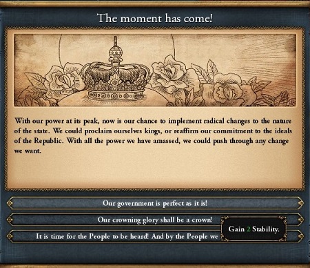 上の選択肢は現状維持と安定度の上昇,真ん中は君主制への移行,下は貴族エリートへの移行.