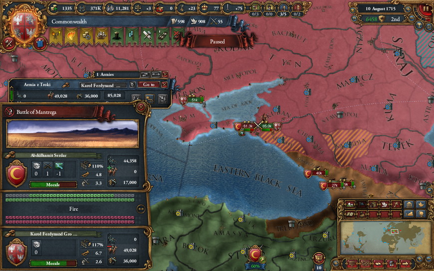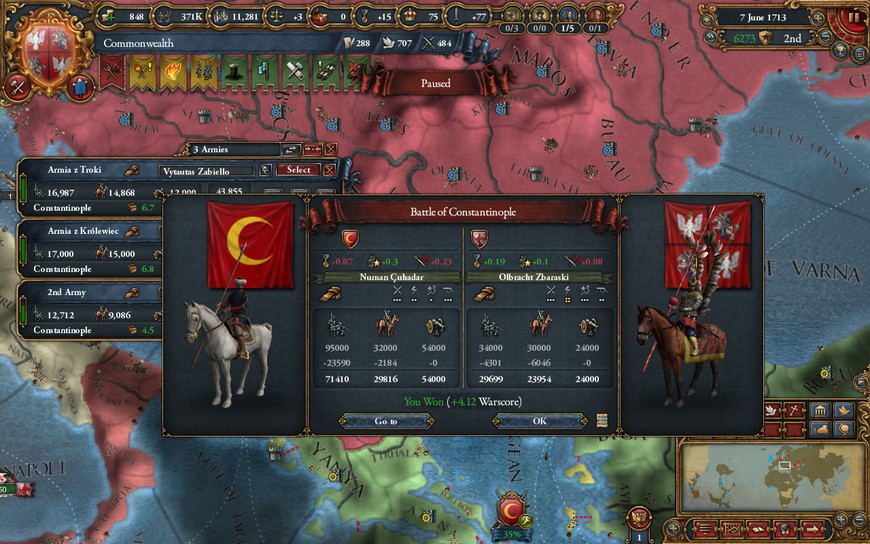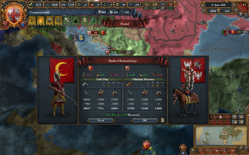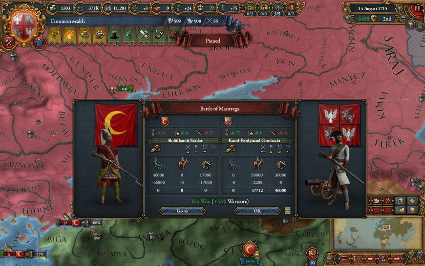 さて。こんな感じで前編の強制決戦方式を使い、敵軍の一番硬いところを粉砕し、彷徨う3万から4万ほどの小勢を接触事故で消滅させながら、七年戦い和平した。