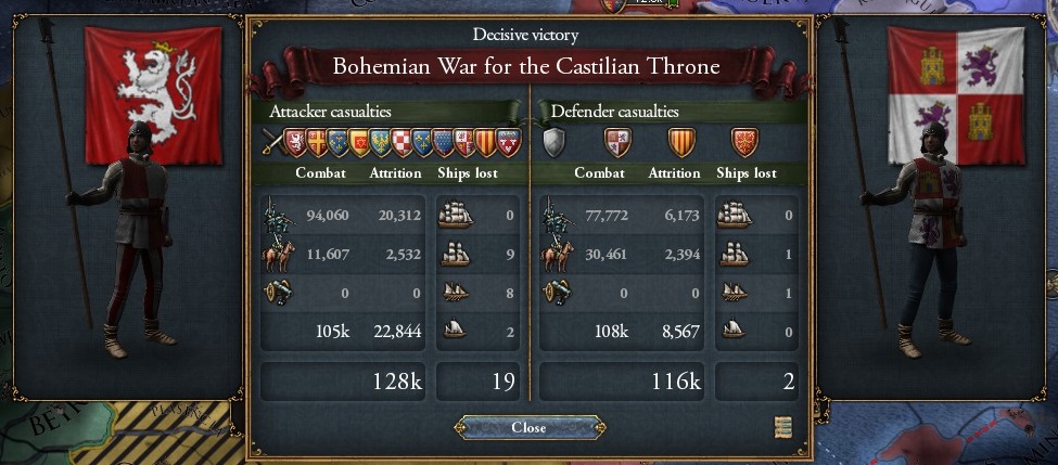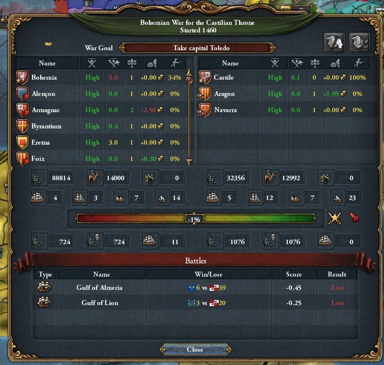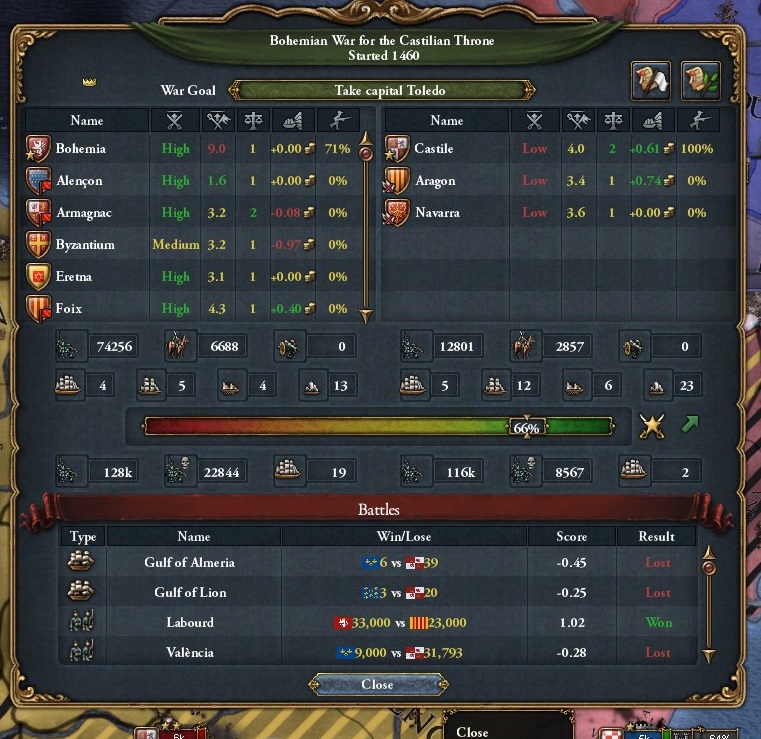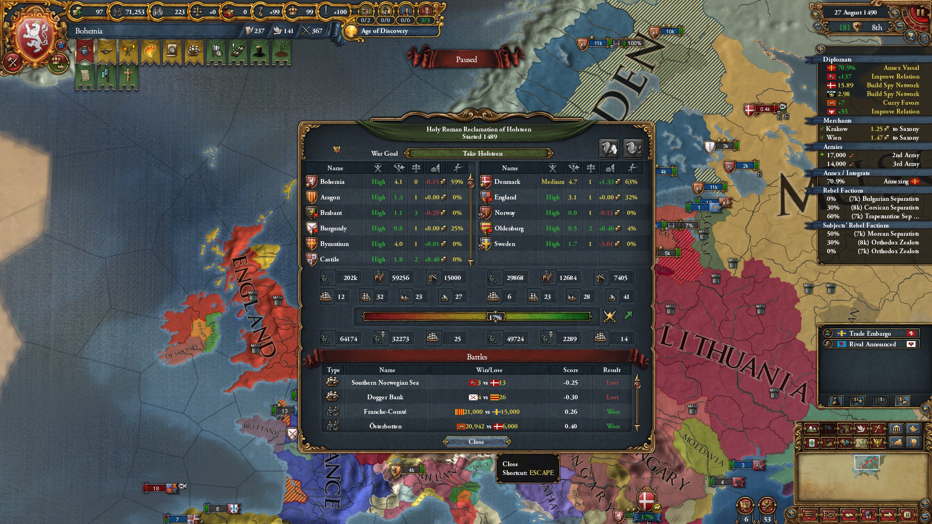 敵の戦争疲弊度が高まってたから、戦勝点が足りない状況で同君下位に置けたわ。