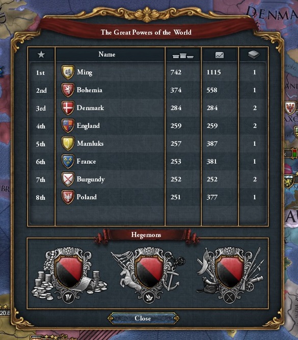 追放しなければ、国家変態や衛星国の利用なしに、ミッションと合わせて同君連合を10ヶ国用意できるのはすごいわね。何はともあれ、カスティーリャとアラゴンを同君下位収めたことで列強外から列強2位まで国力が増大したわ。