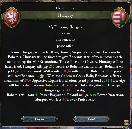 戦争は常に圧倒していたため直ぐに終結しました。講和内容はスロヴァキア全土の割譲とクロアチアの種地獲得、賠償金です。