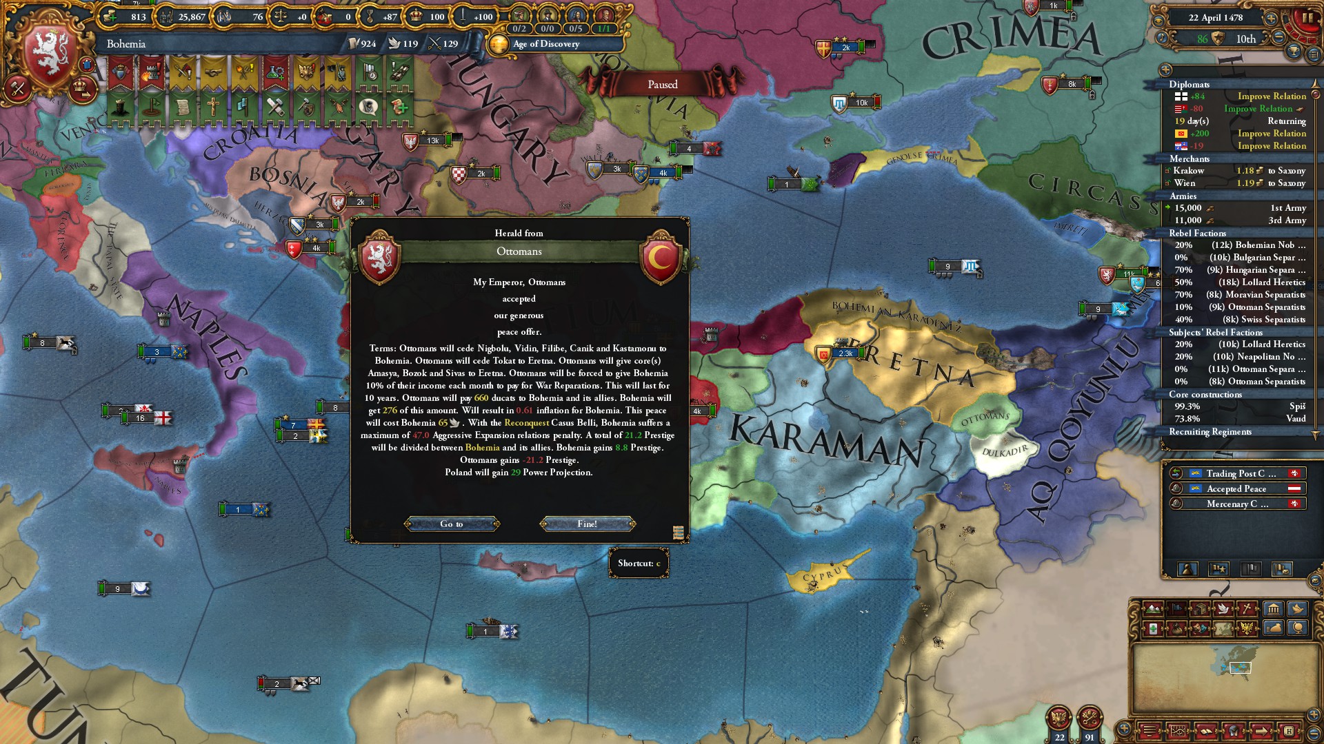 第三次ハンガリー戦終結。セルビア、オスマンから独立したブルガリア、属国解放したクロアチアに領土返還させました。また、モルダヴィアを属国から解放させました。