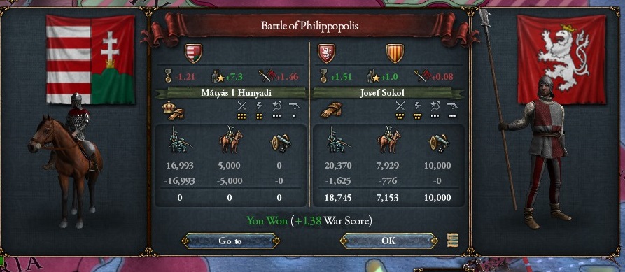 イベントで引いた☆3将軍とフニャディ・マチューシュと戦争になったガァー。兵力差と技術差で地形ペナルティありでも殲滅できたガァー。