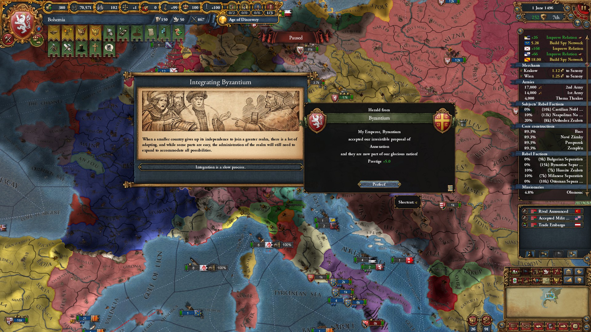 翌年1496年には、ビザンツを外交併合しました。これでアナトリアまでHRE領に編入できるので、バルカン諸国にExpand EmpireのCBが適用できますな。