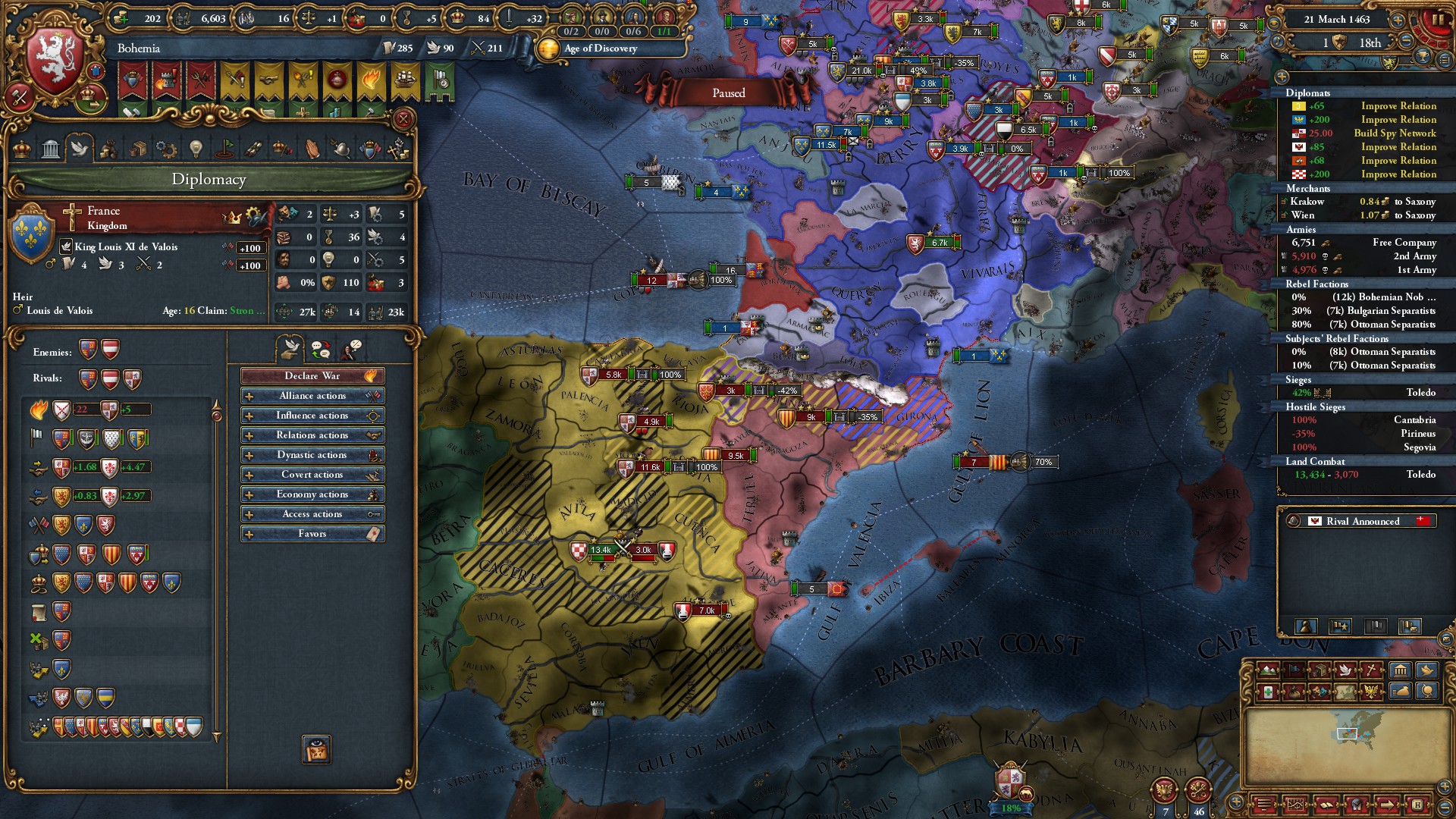 カスティーリャとは、あらかじめ好感度を上げていましたので、直ぐに婚姻締結できました。王位請求したせいで、ザクセンの好感度が低下して皇帝選挙がやや不利になりましたが、許容範囲ないです。