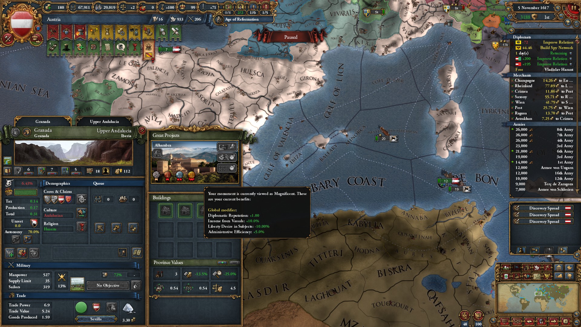 アルハンブラ宮殿がtier3まで上がったわ。統治効率+5%よ!