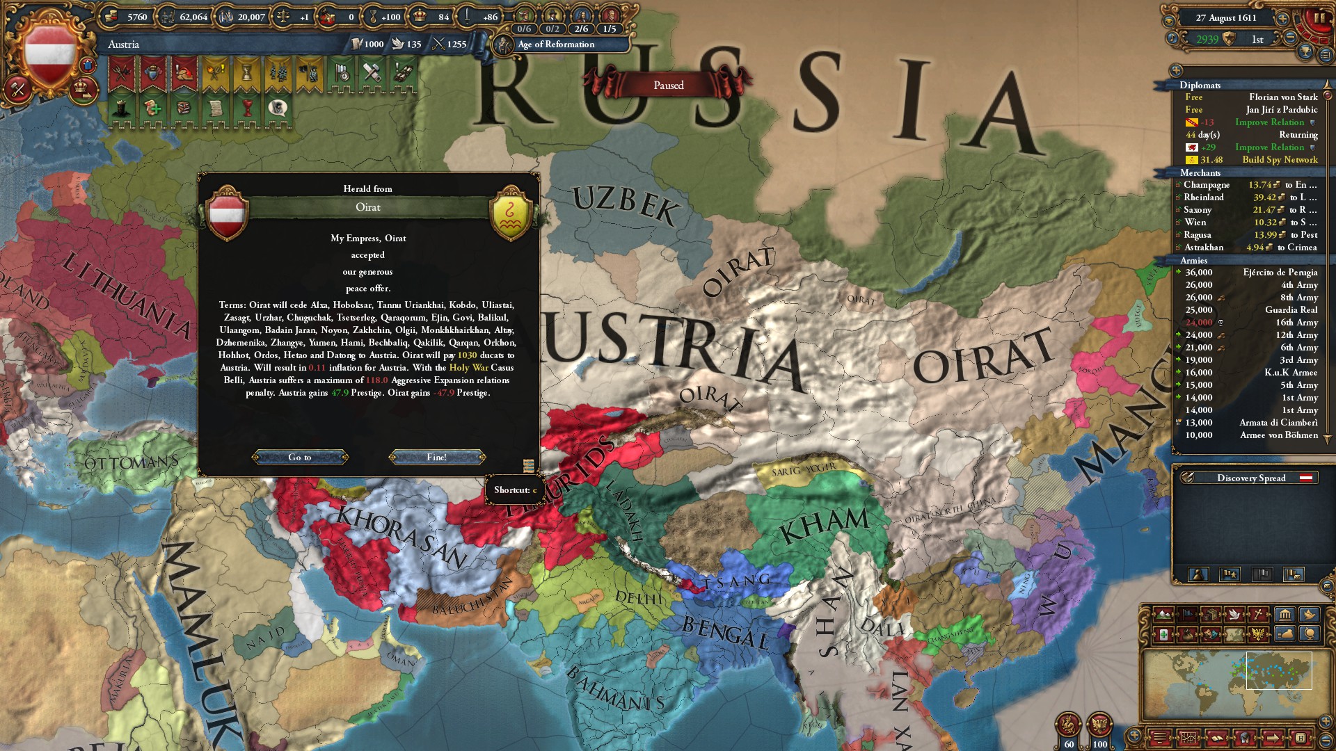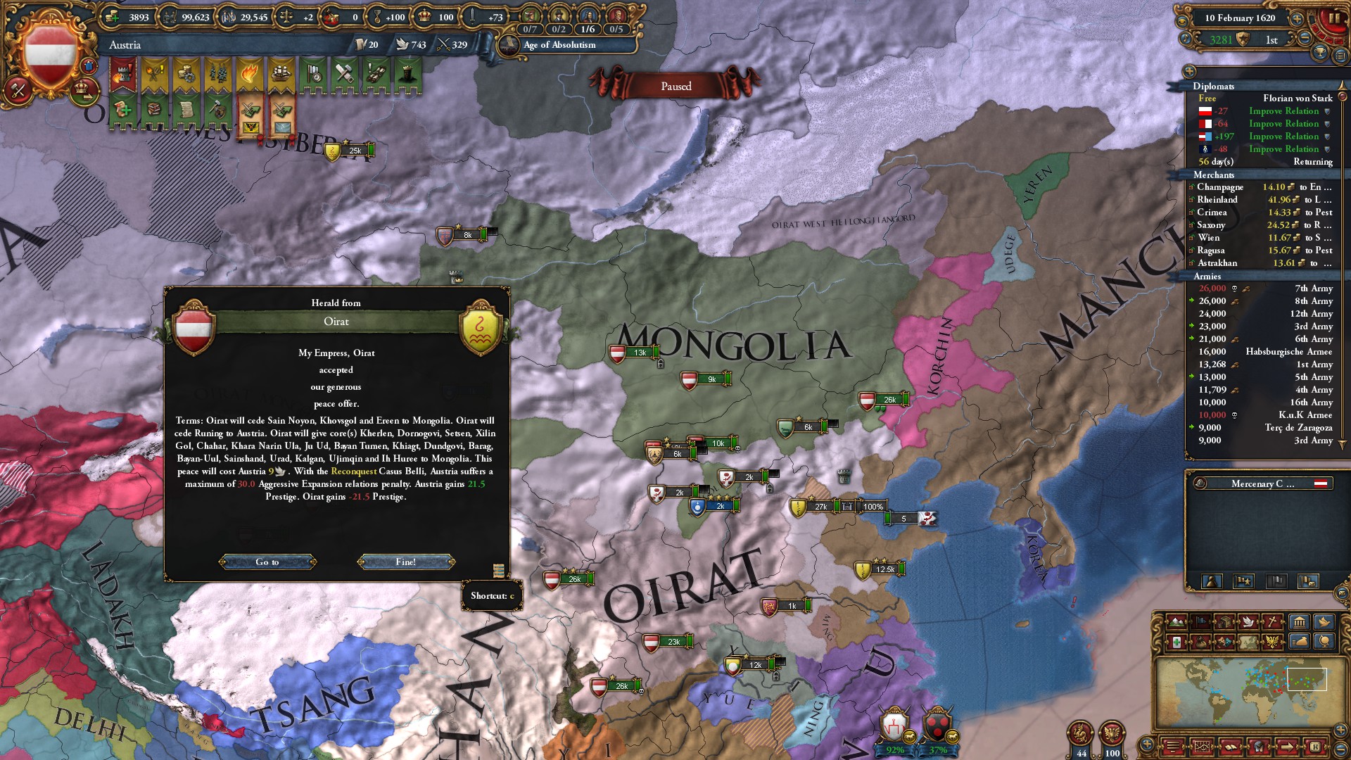まあ、ミッション報酬、アイデア、ポリシーで外交併合コスト-70%になる予定だから問題ないわね。モンゴルは1625年に外交併合したわ。