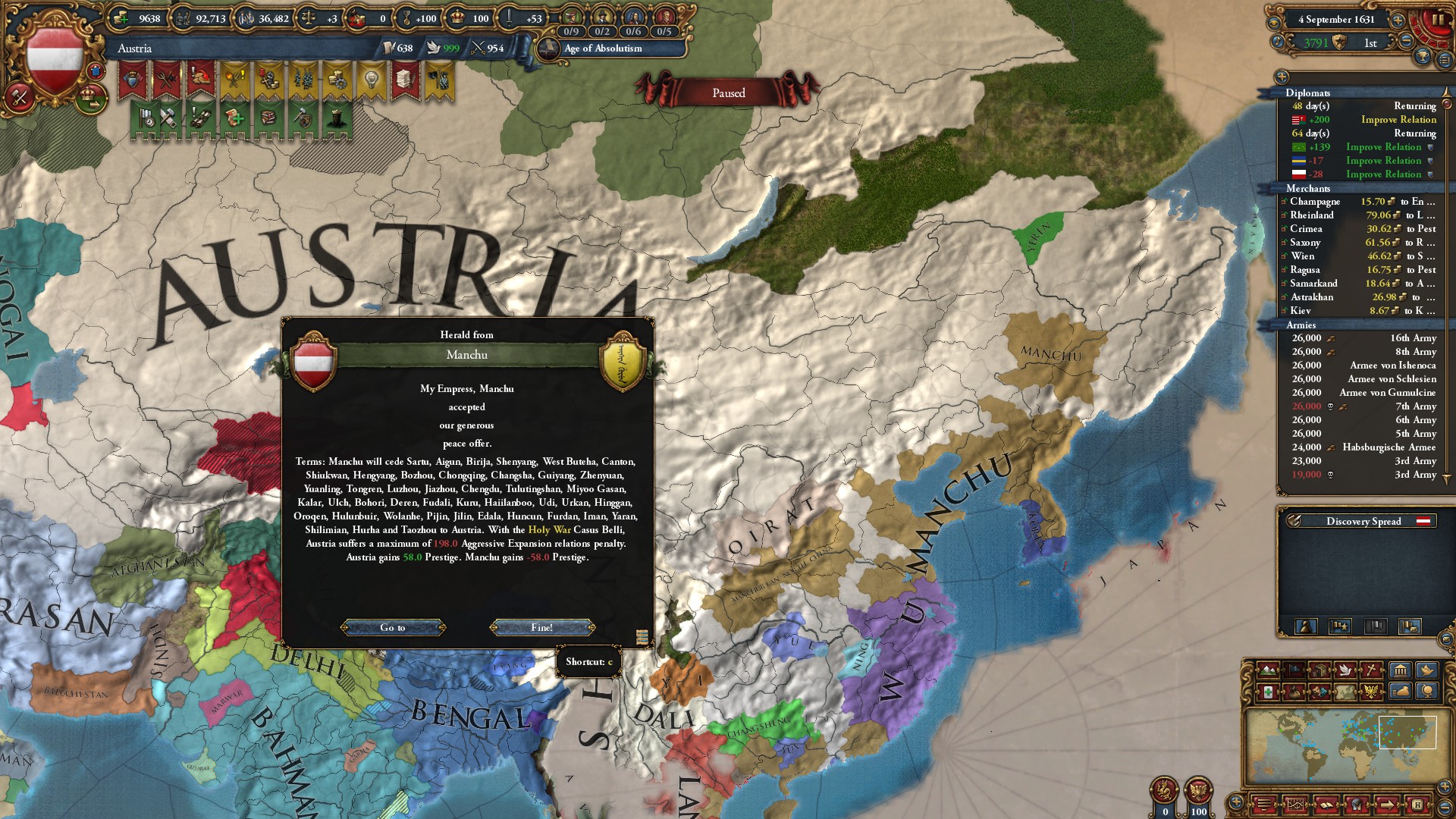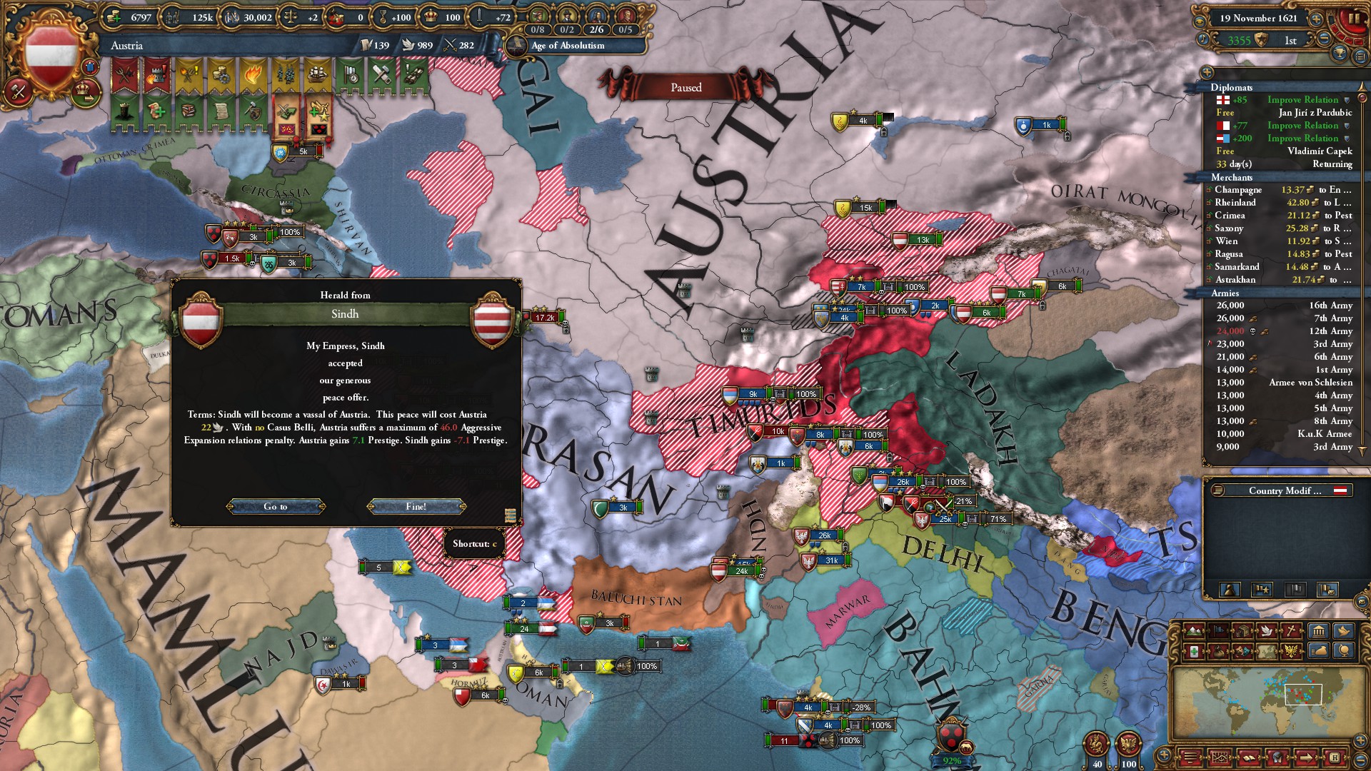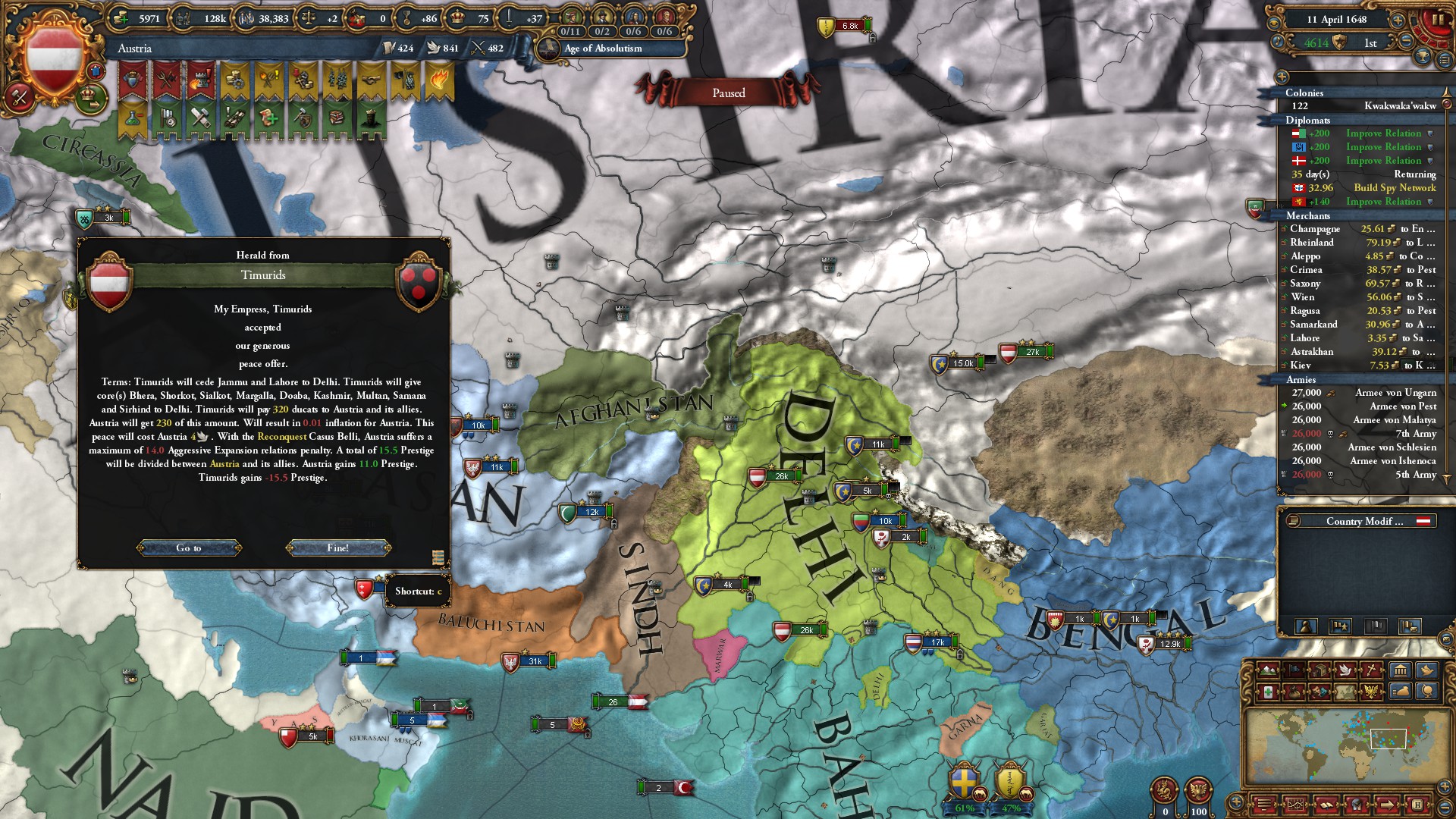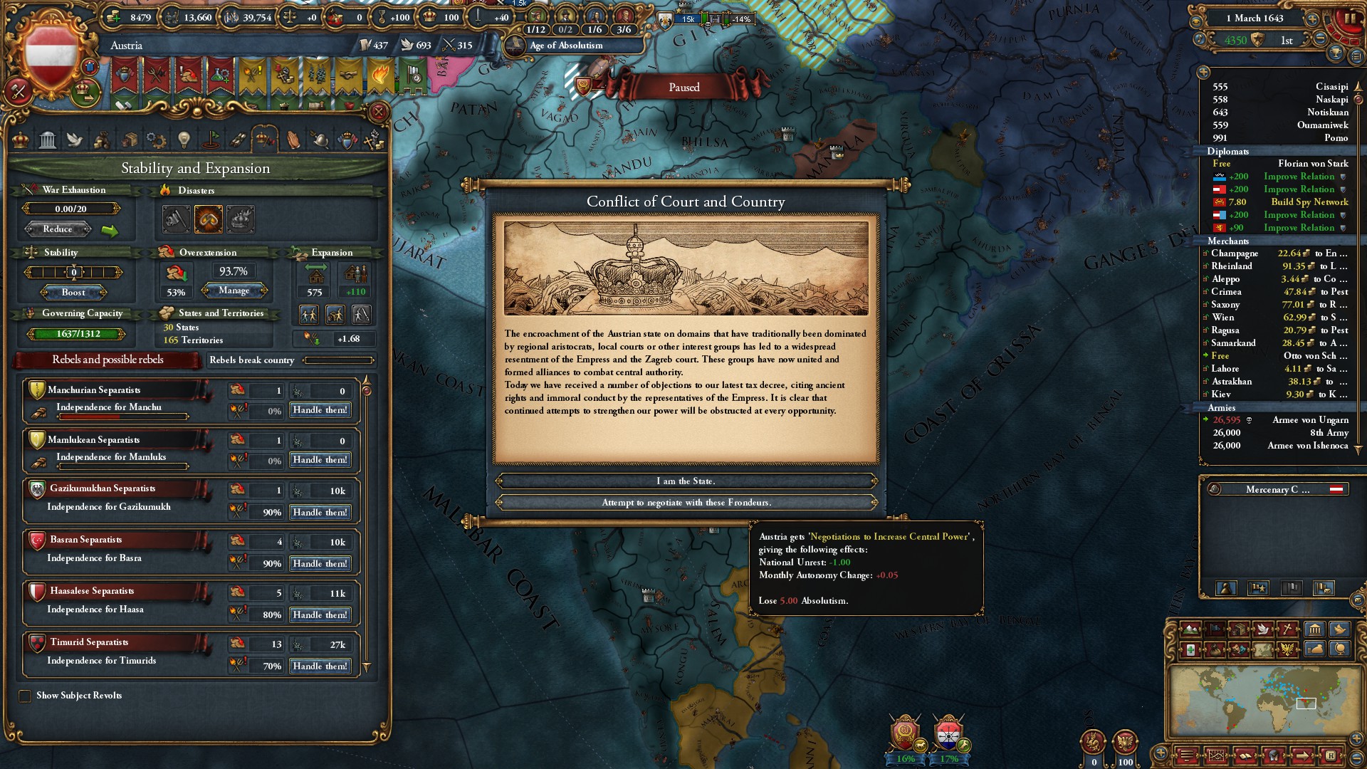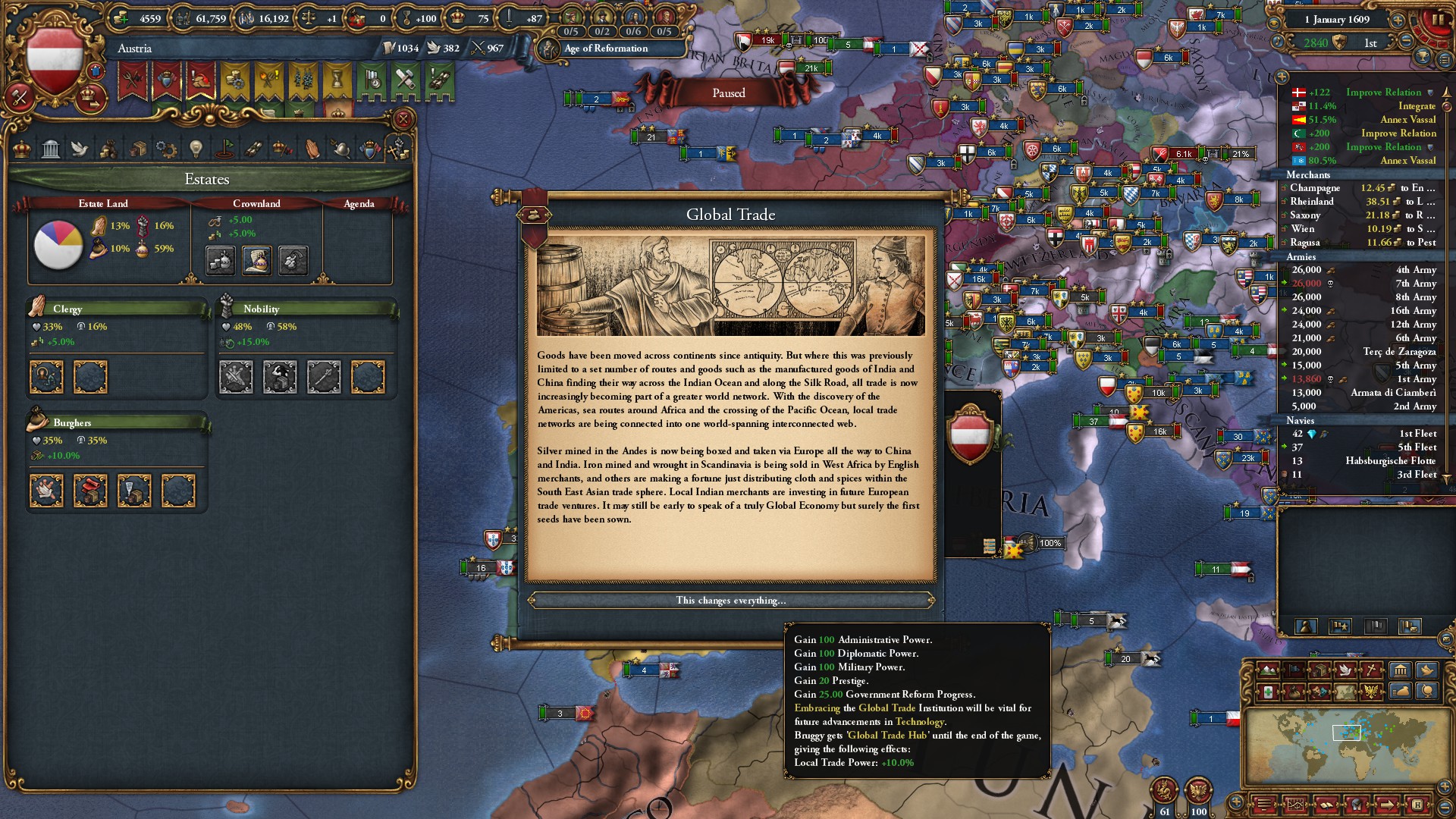 権勢アイデアとボヘミア・サルディーニャ=ピエモンテ・オーストリアのミッション報酬と合わせて、外交併合コストは-75%ですな。サルディーニャ=ピエモンテではなく、オーストリアNIにしていたら凄まじかったでしょうな。