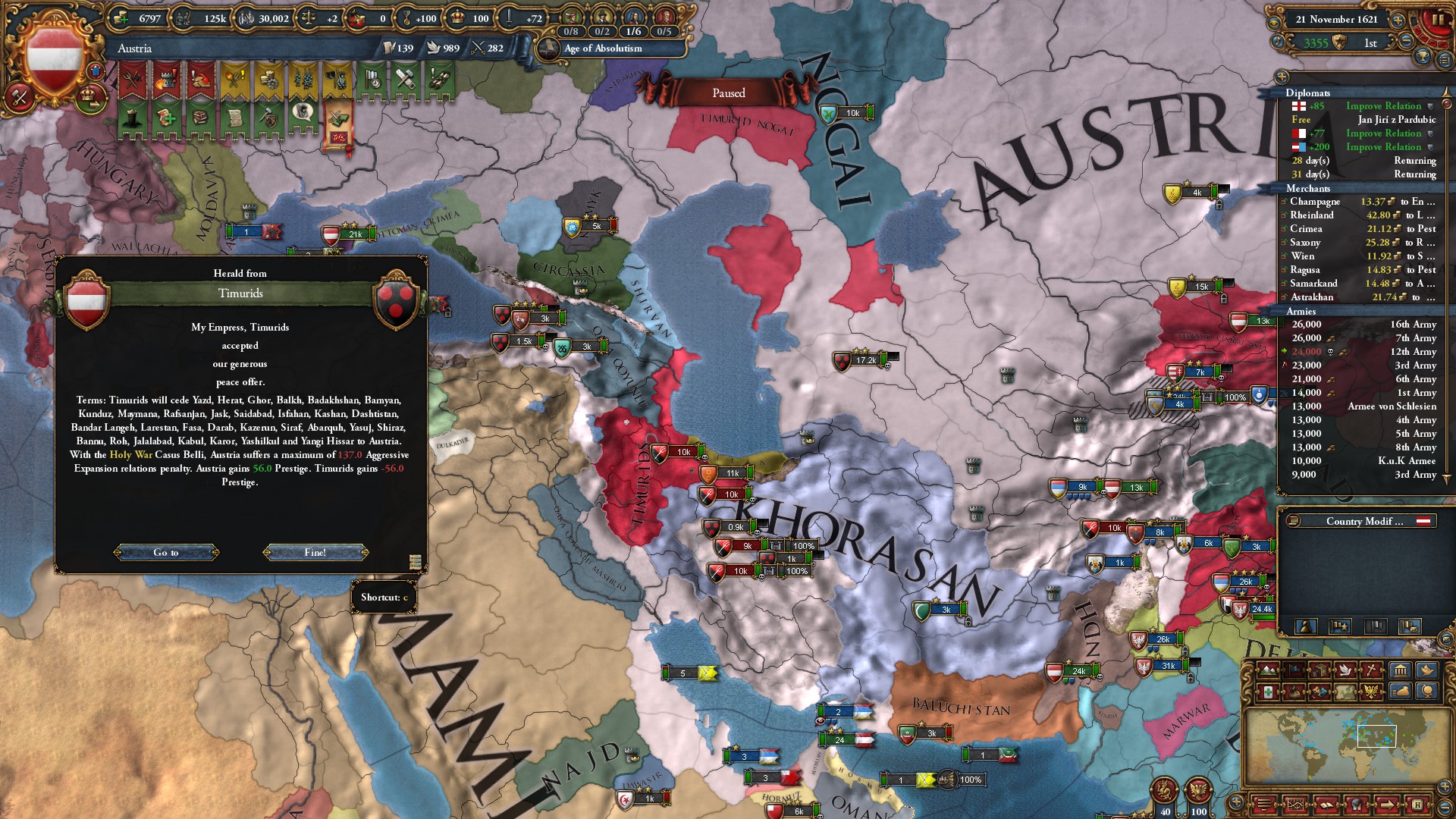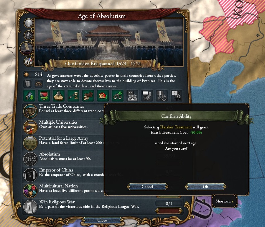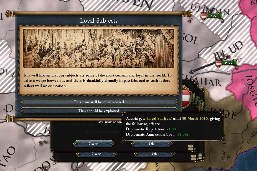 トランスオクシアナを併合後、外交評判+1と外交併合コスト-15%を手に入れたわ。