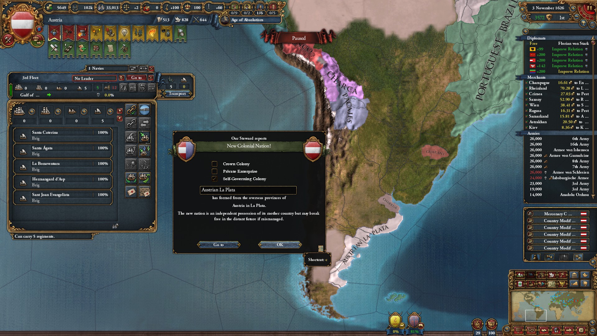1626.11にラプラタに植民地国家が成立したわ。ペルーが残ってるけど、これ以上南米には植民しないわ。後、もう植民地国家成立は報告しないわ。大したことでもないし。