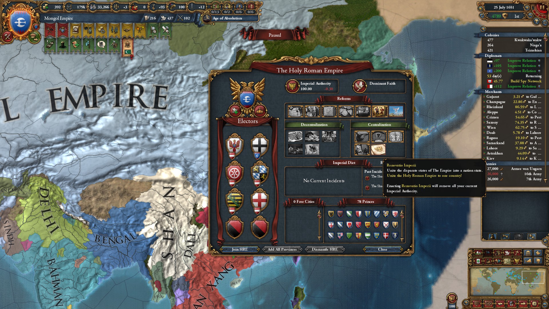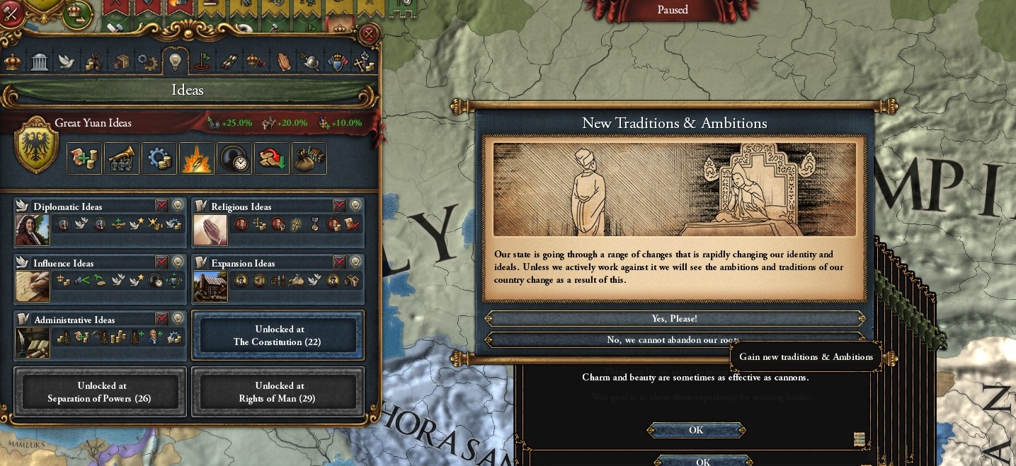 政府改革は最終段階まで勧められたわ。内容は、「人的資源+20%」、「安定度コスト-10%&宗教統一度+15%」、「ステート数+3&絶対主義の最大値+10」、「razeによって得られる君主点+33%」を選んだわ。