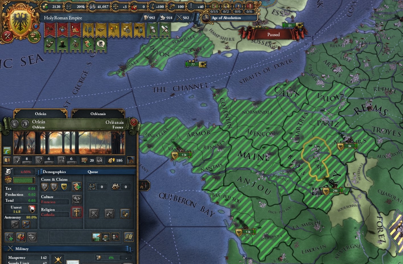 Raze後はフランスを建国して統治・改宗を任せますぞ。なお、解放前のRazeを恨んでおり、友好度にマイナスの補正がついた模様です。