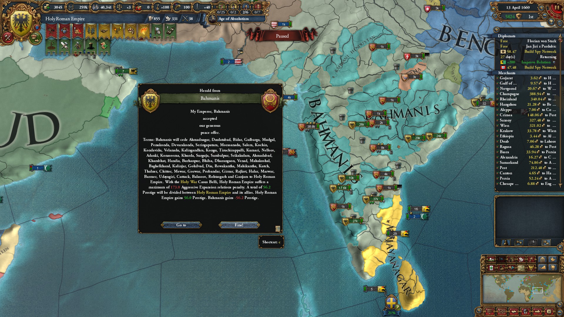 停戦期間終わったからバフマニーを併合したわ。一気にデカン以南を支配下に入れたわ。