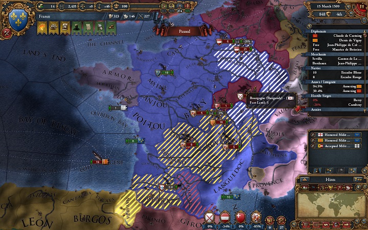 さらに4年ほど頑張ったのですが。 スイスとブルゴーニュにも宣戦されたところで心が折れました。 ギブアップ。 戦勝点120点分くらい条件積んでも講和してくれないスペインさん酷いです。