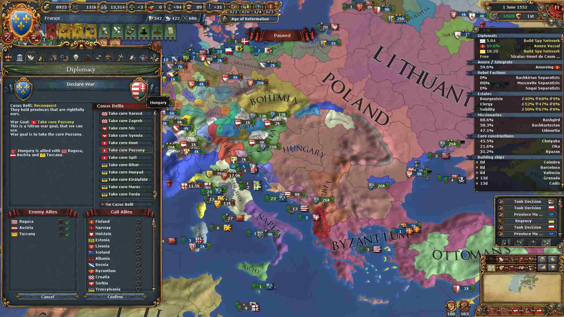 ハンガリーも復活させた帝国諸侯のコア州返還で攻め込みます。