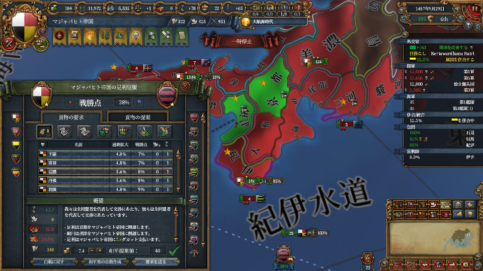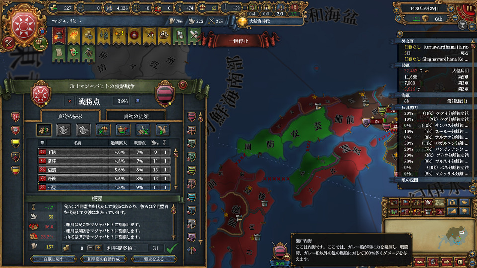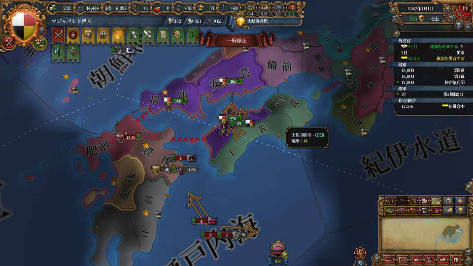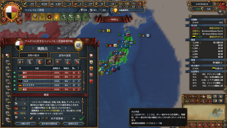 足利の停戦期間が明けるまで平和に過ごして冷ますことにします。その間日本列島に遷都し、東南アジアのステートを金山以外剥がし、主要文化を西国に変更しました。