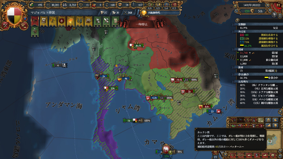 1501年、西のほうでも軽く領土を奪い、ミッション達成しました。全世界にマジャパヒトCBを投射できます。