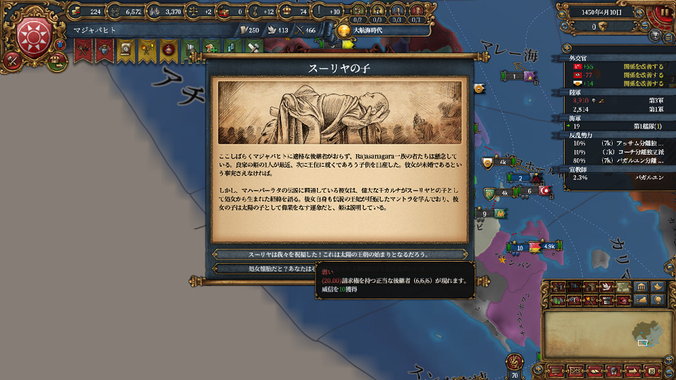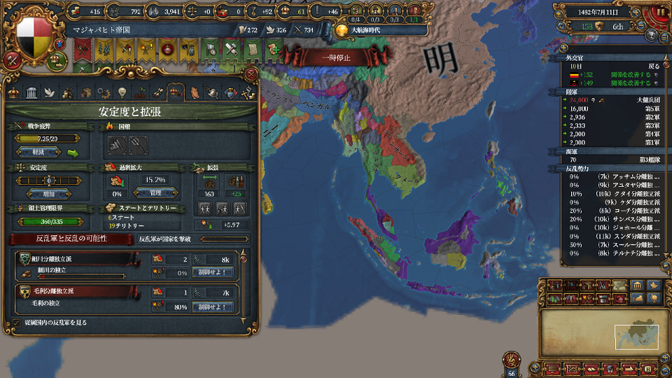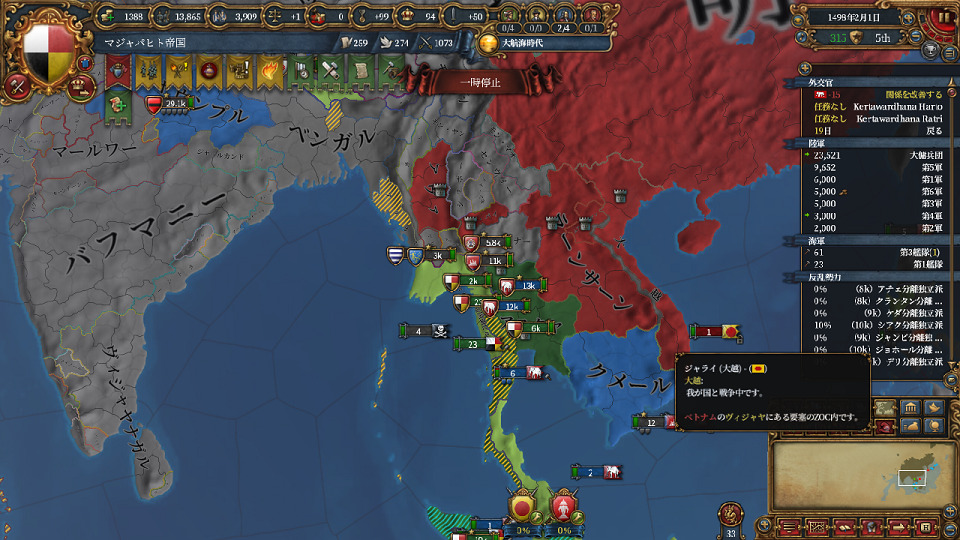 1444年12月にマジャパヒトの国難発生、選択肢を押すと安定度が-3になります。クリックせずに放置するならNOCBを2発撃てます。