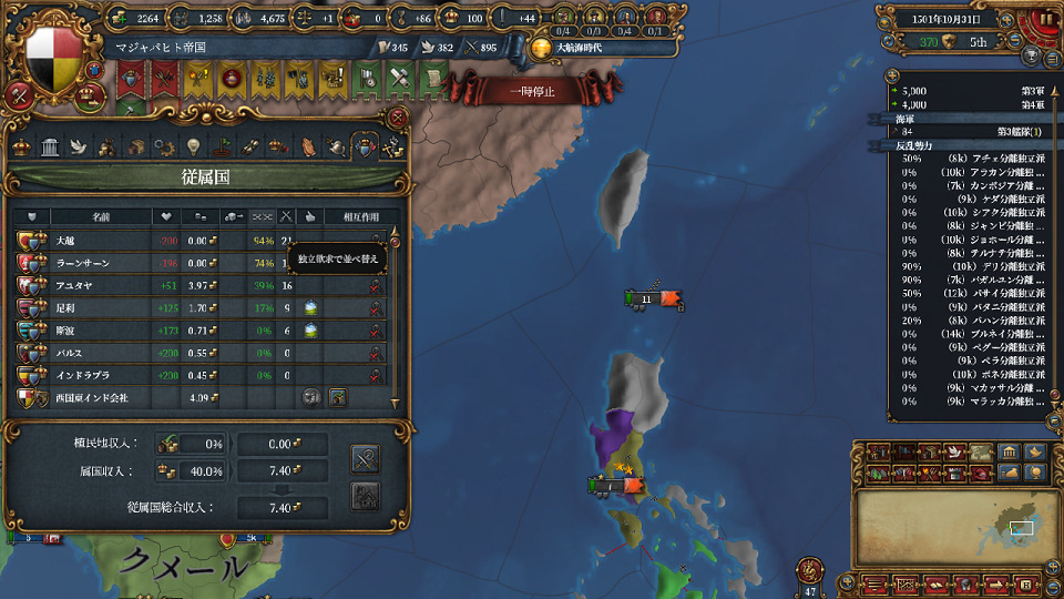 最後に朝貢国のバランバンガンの朝貢関係を切っておきます。朝貢国同士なら宗主国の介入招かずに戦争できるので、バリ島征服して遺産のレベル落とすのを阻止しておきます。