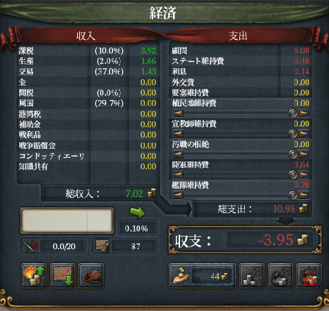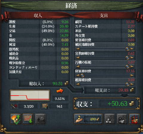 →今回は途中まで軍事に君主点1入れないプレイの実験も兼ねてましたが、有効性はよく分からないという結論…
