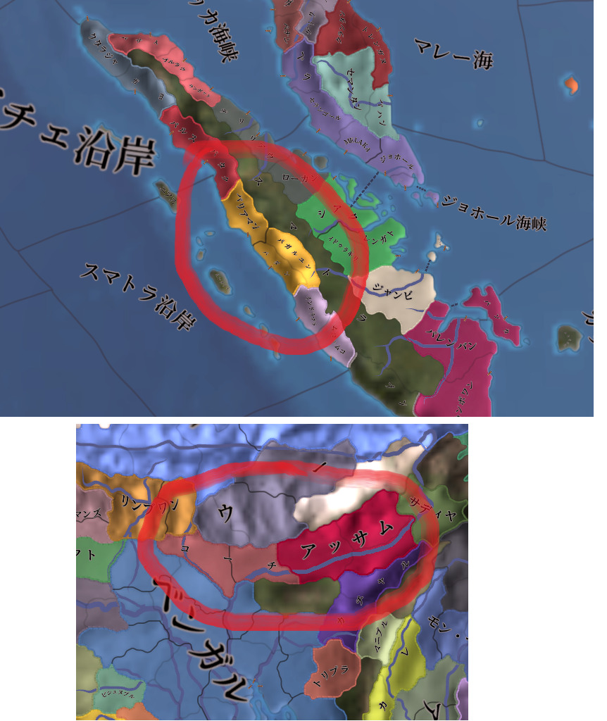 もう1つは遠く離れたインド北東部のコーチ、初期同盟でついてくるアッサムを個別で武力属国化を行うとコーチ領も中核化することができます。
