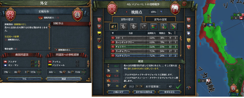あとは楽勝ムード、呼んだ同盟国のクメール君が被害を担当してくれてます。アユタヤ大名化に成功しました。