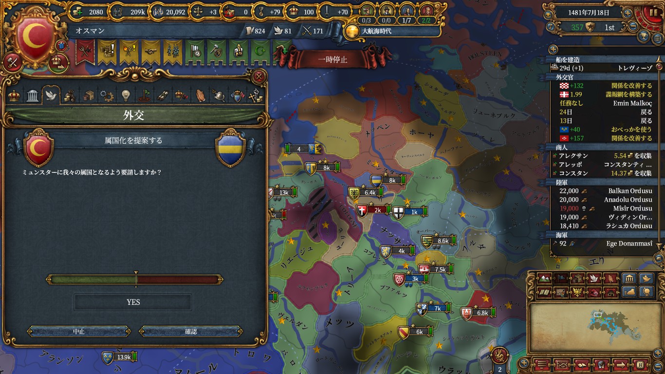 諜報最後の属国化受諾補正+15のおかげでミラノ・クロアチア・フィレンツェといったそこそこ大きい国を正教化すれば属国化が狙えます。