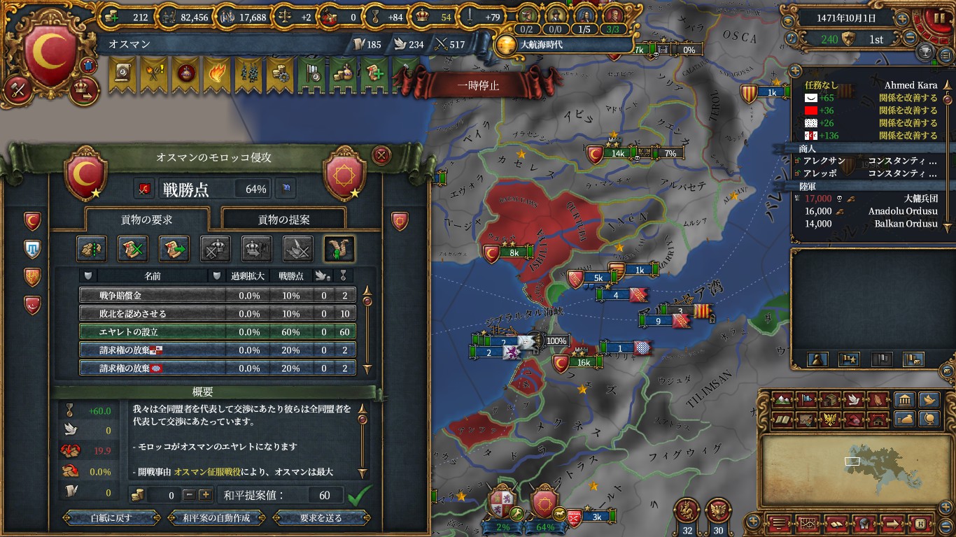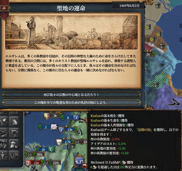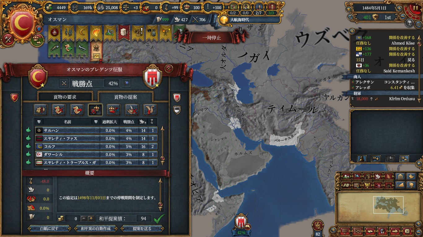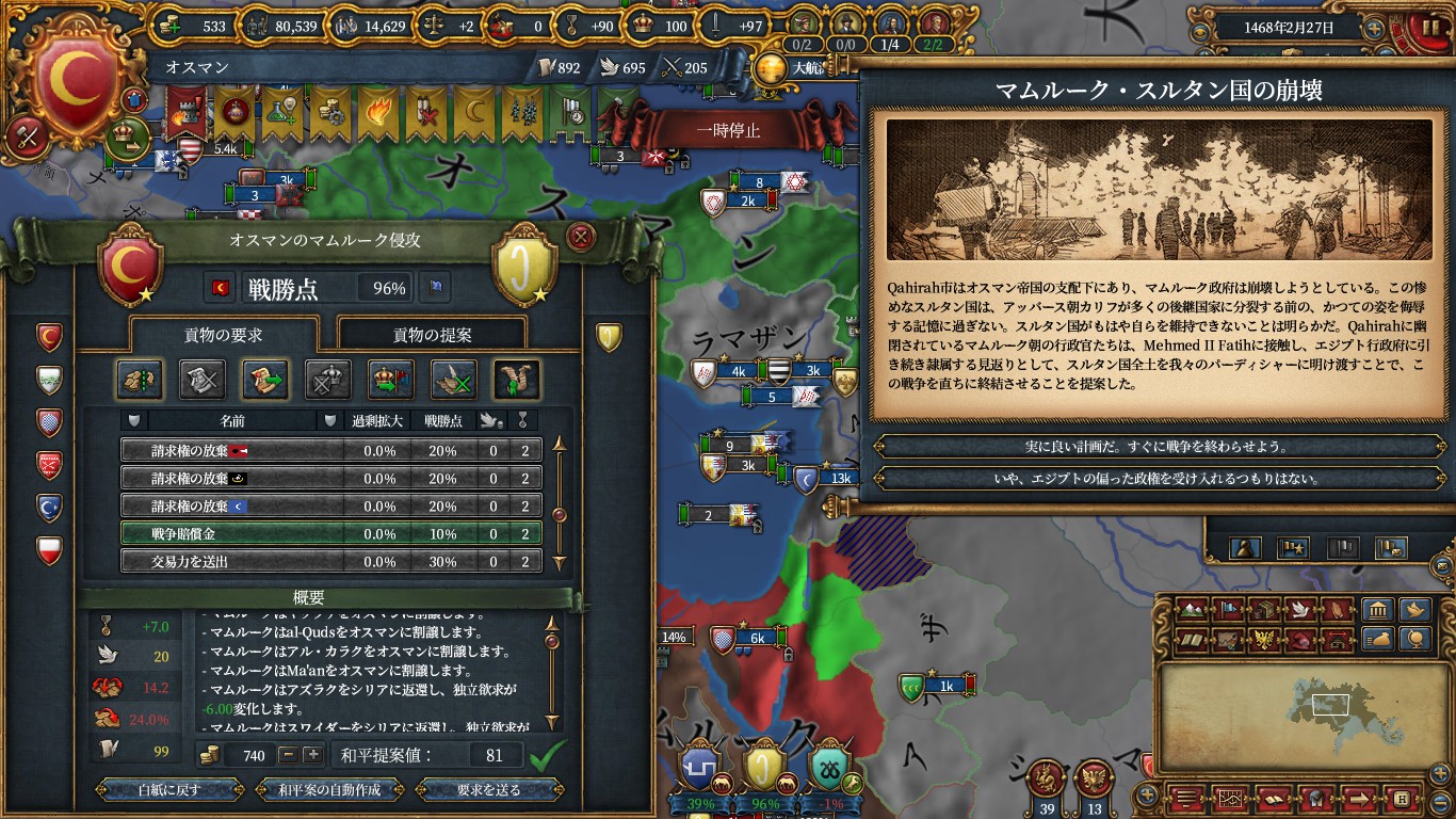 その前にマムルークと和平して、エルサレム(イベントからアイデアコスト-5%と君主外交+1)とアマーン(ペトラモニュメント/外交評判)を獲得し、ついでに金銭も要求。