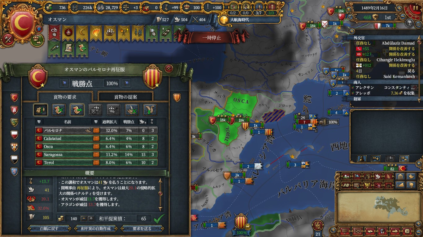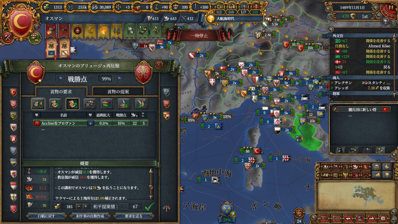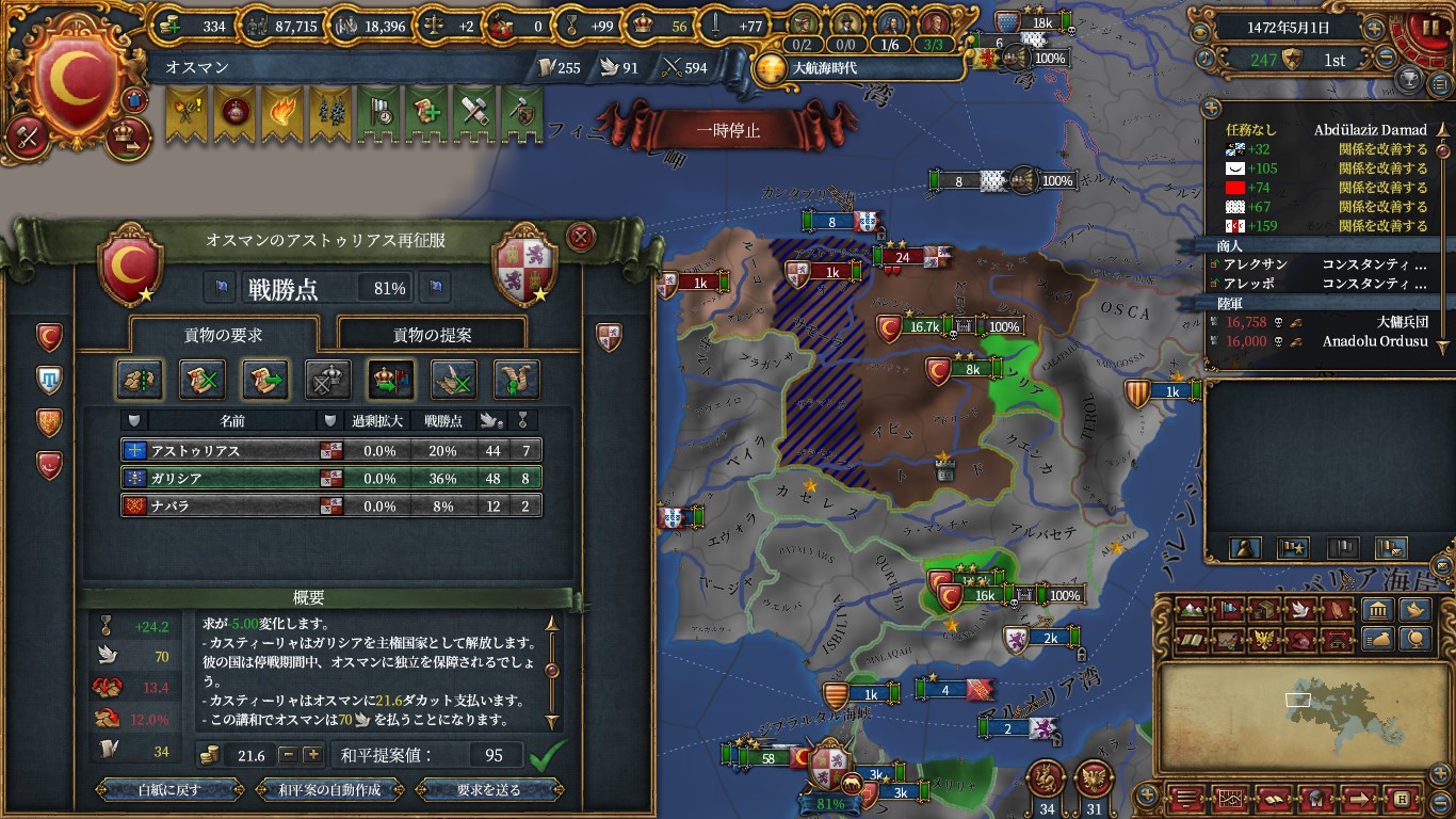 その前にマムルークと和平して、エルサレム(イベントからアイデアコスト-5%と君主外交+1)とアマーン(ペトラモニュメント/外交評判)を獲得し、ついでに金銭も要求。