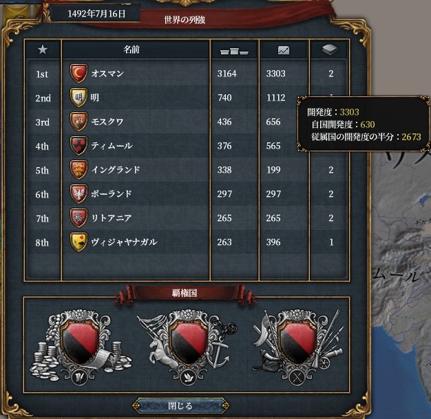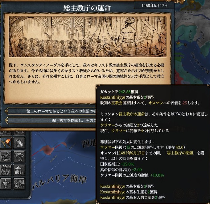 今回はもう金に困らない時期でしたので、下の選択の総主教庁の閉鎖による金銭の恩恵はあまりありませんでしたが、既に属国にしたい正教国がいない(正教国への評価マイナスが気にならない)のとコンスタの開発上昇が美味しいので選択しました。