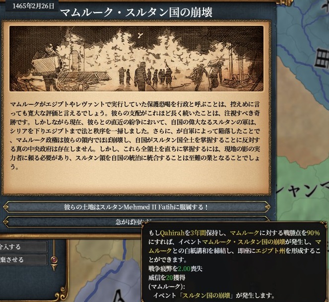上を選んだ場合、3年後以降に敵首都を占領して戦勝点90%以上だとマムルークをコアエヤレトにすることができます。