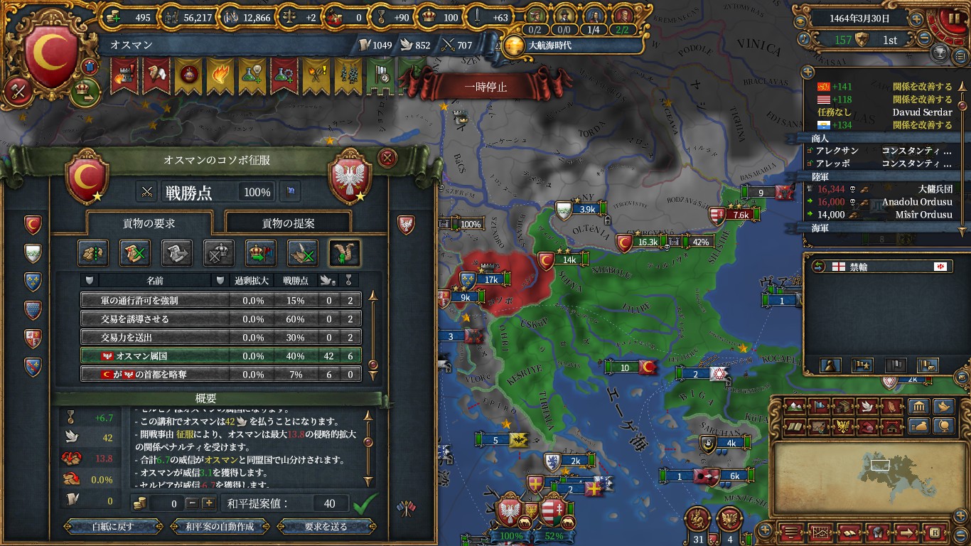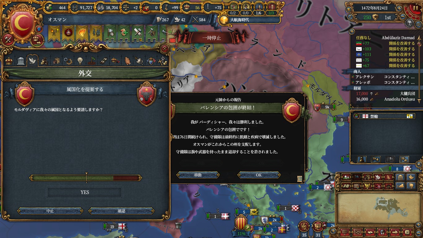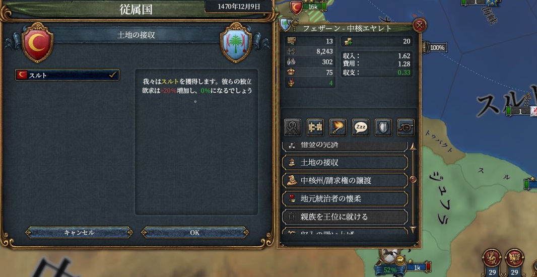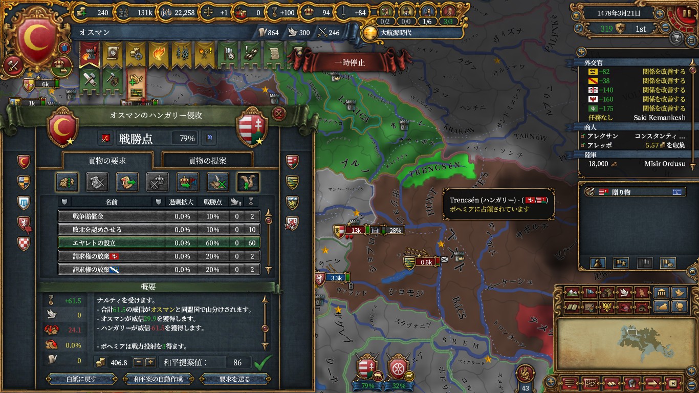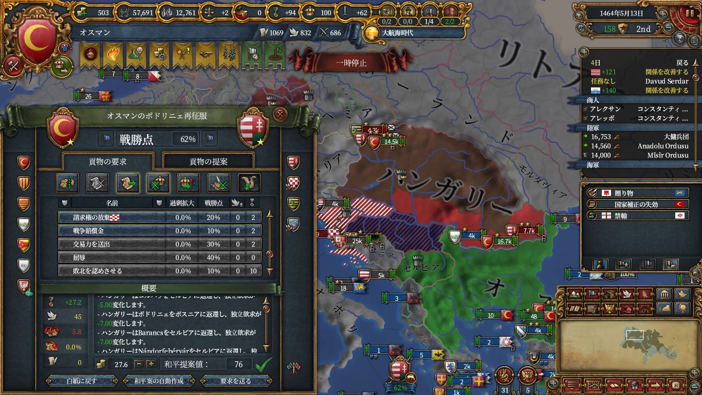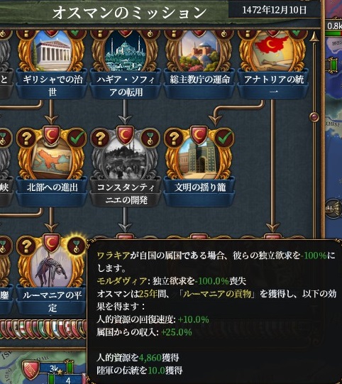 これで、ミッション「ルーマニアの平定」から時限の属国収入補正が貰えるので、その前提ミッション「北部への進出」も達成し、ハンガリーへのエヤレトCBもゲット