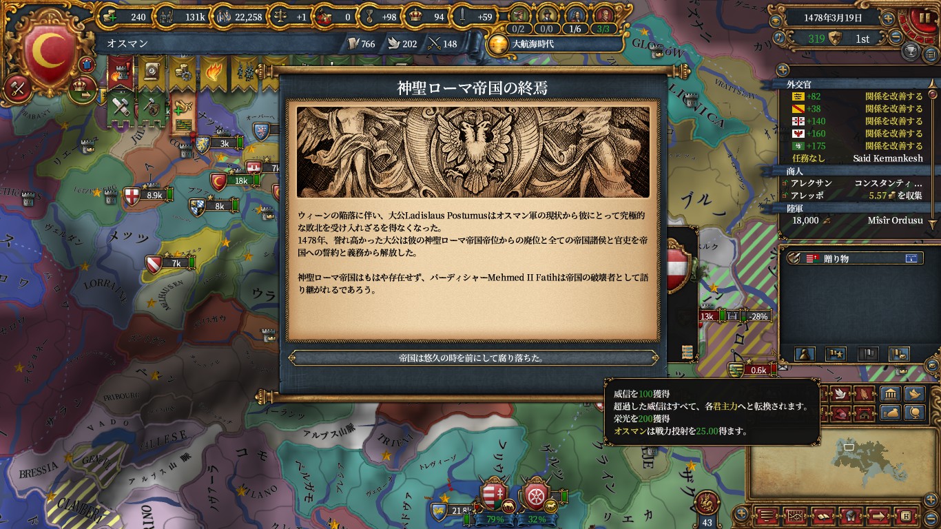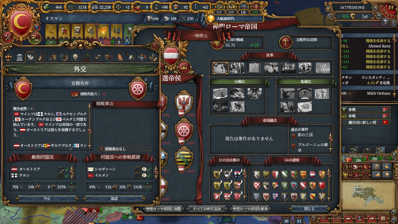 1478年、これらの選帝侯と皇帝の首都を占領し、他選帝侯とは同盟しているのでHRE解体。