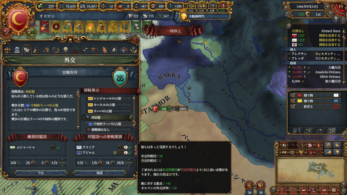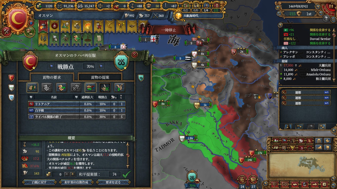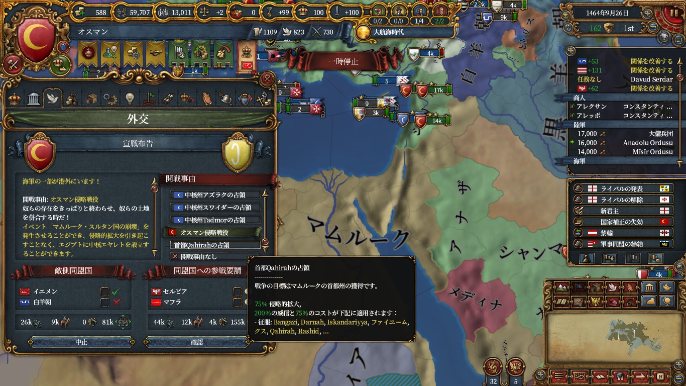 あとはマムルーク領を塗り絵して、戦勝点が貯まってきたのでアジャムを呼んで黒羊朝に宣戦。