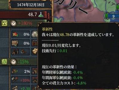 革新性は48と、全君主点コストが-4.8%となっています。