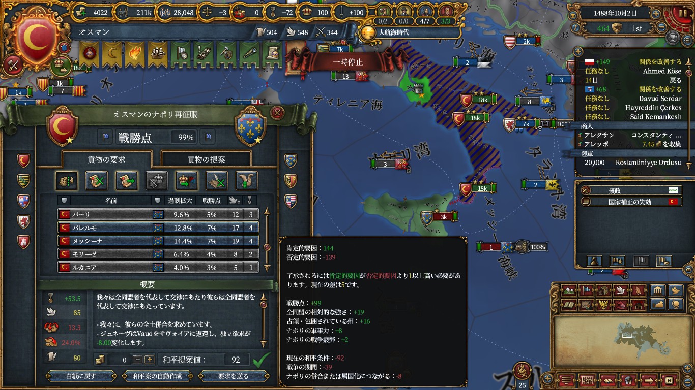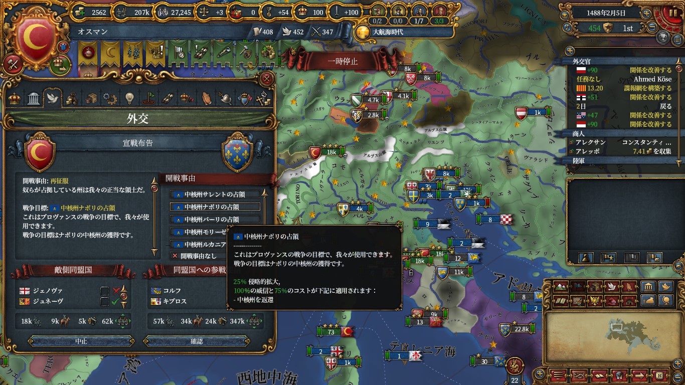 プロヴァンスを戦争に呼ぶならどこの州でも良いですが、参戦させない場合は首都州の返還ができないため、ナポリ以外の州のCBにしているとAE負担が100%のままです。ナポリ州のCBにしていれば、25%で割譲可能です。