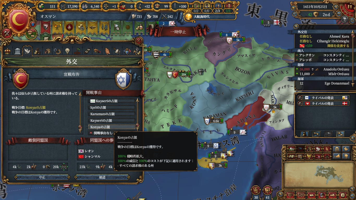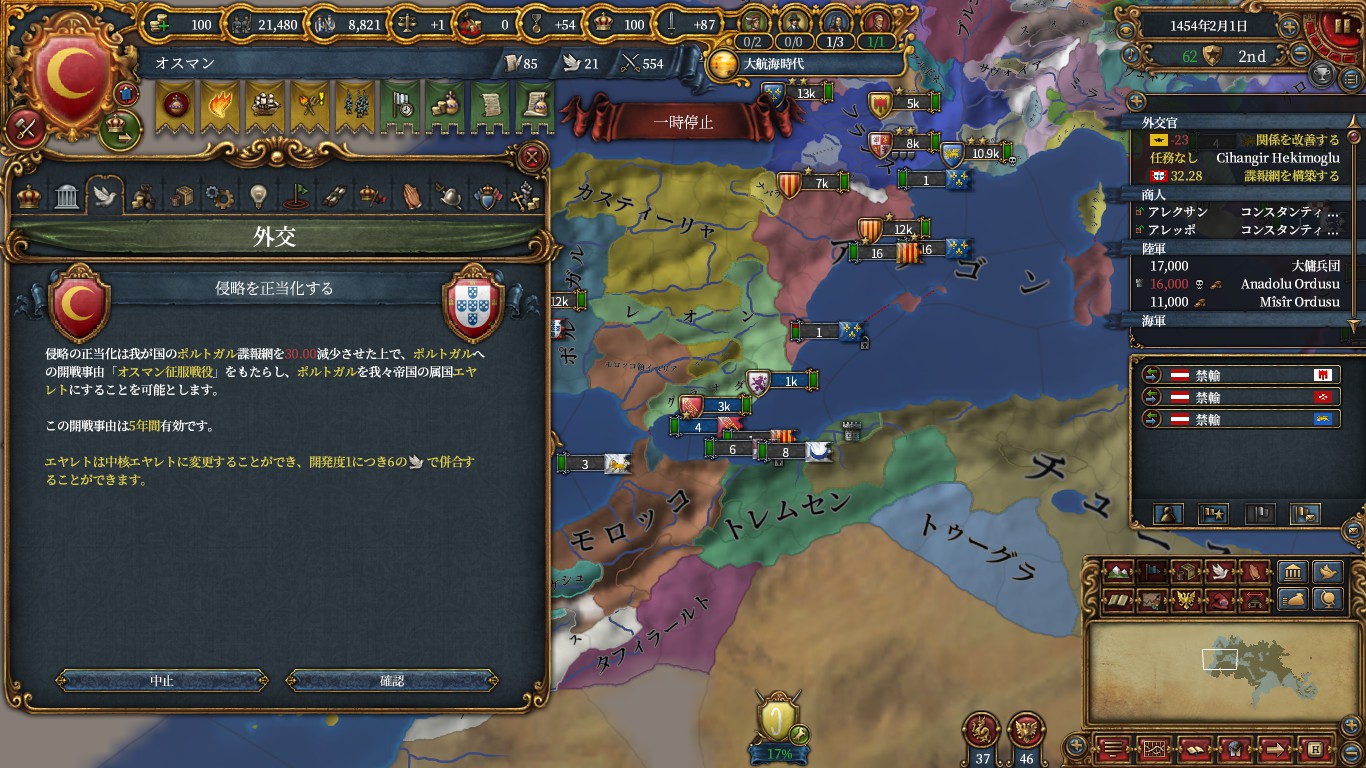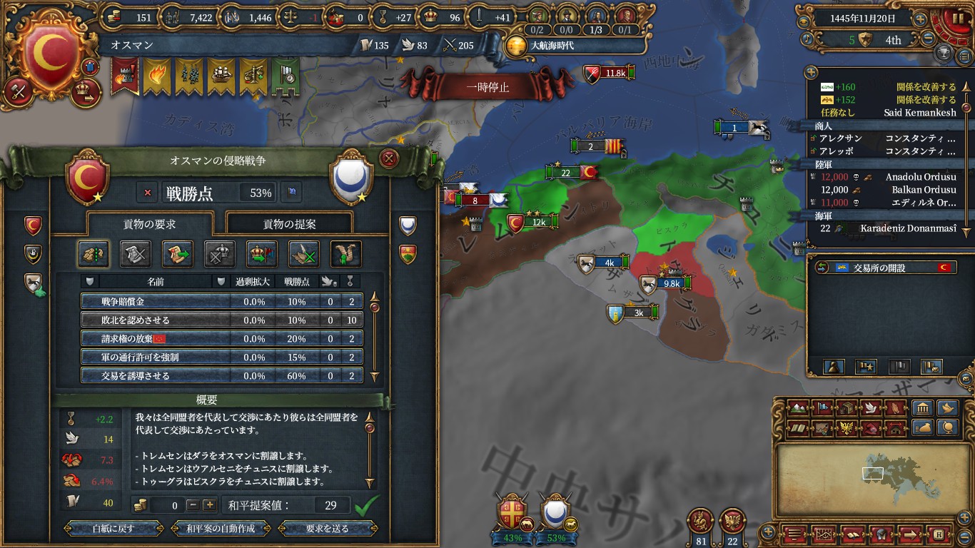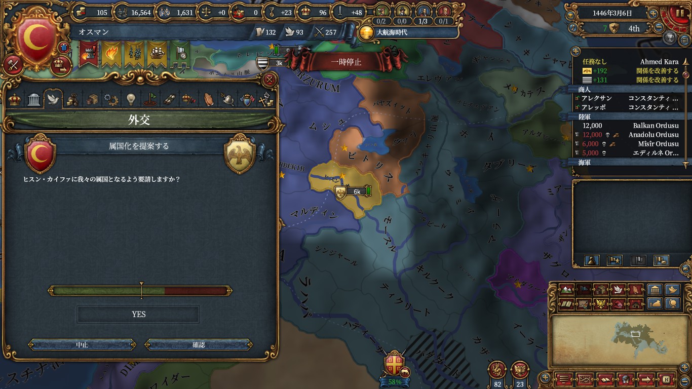 チュニス、クリミア、以下属国化用にアナザ、ドゥルカディル、フェザーン、ヒスンカイファ、グラナダ(トレムセン戦とカスティーリャ戦のAE減)、トレビゾンドと同盟。