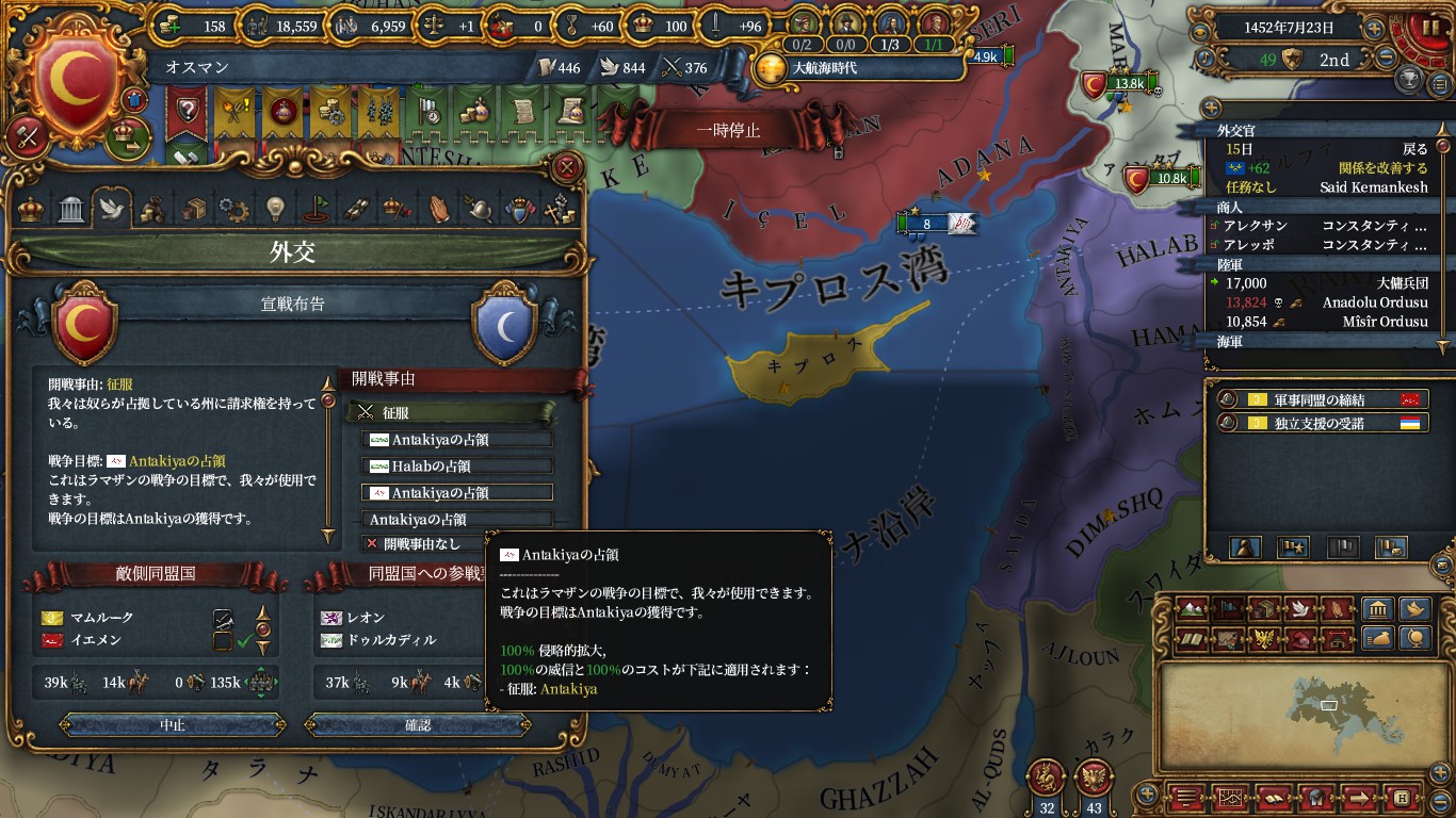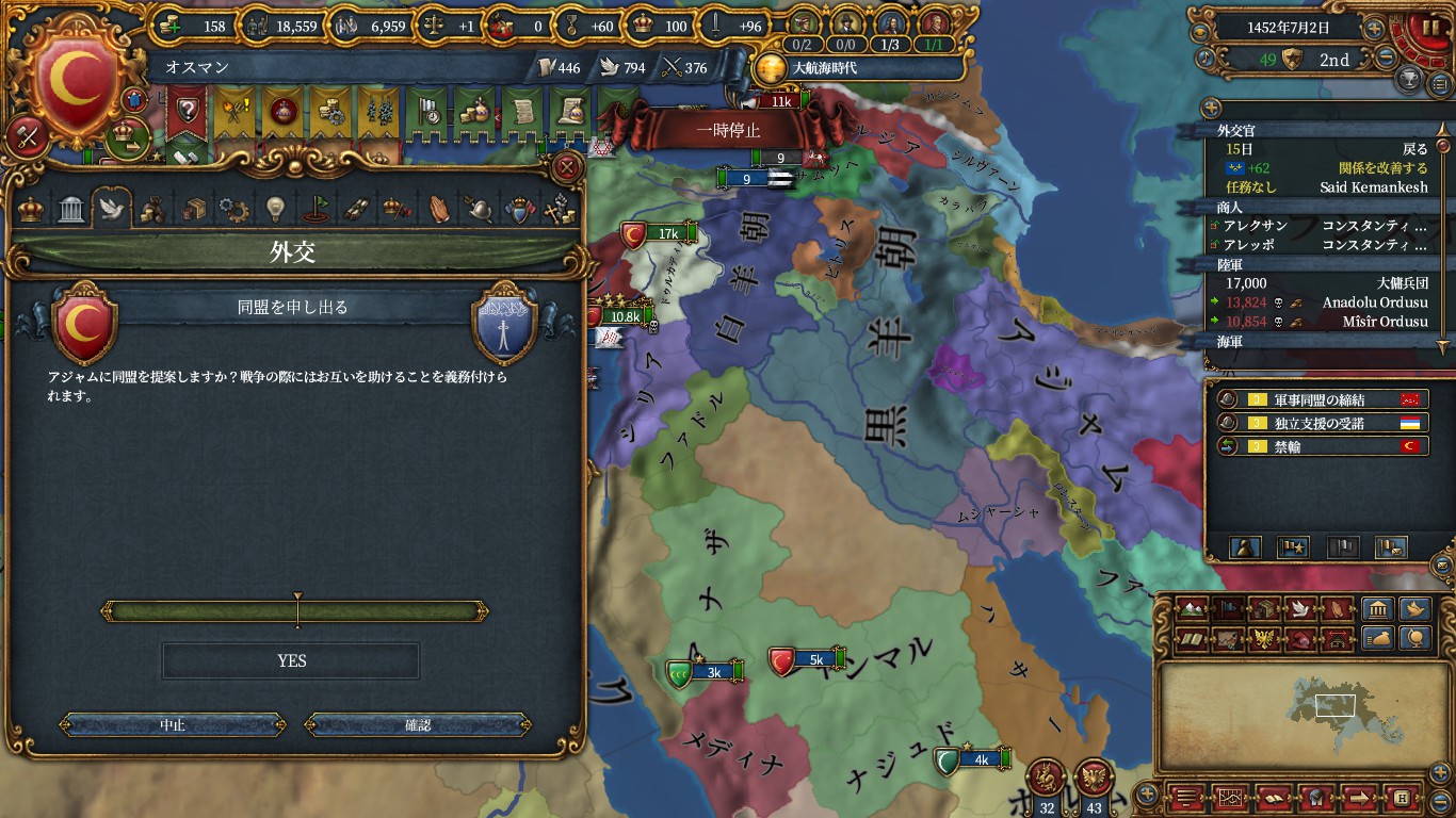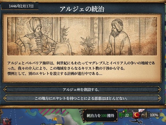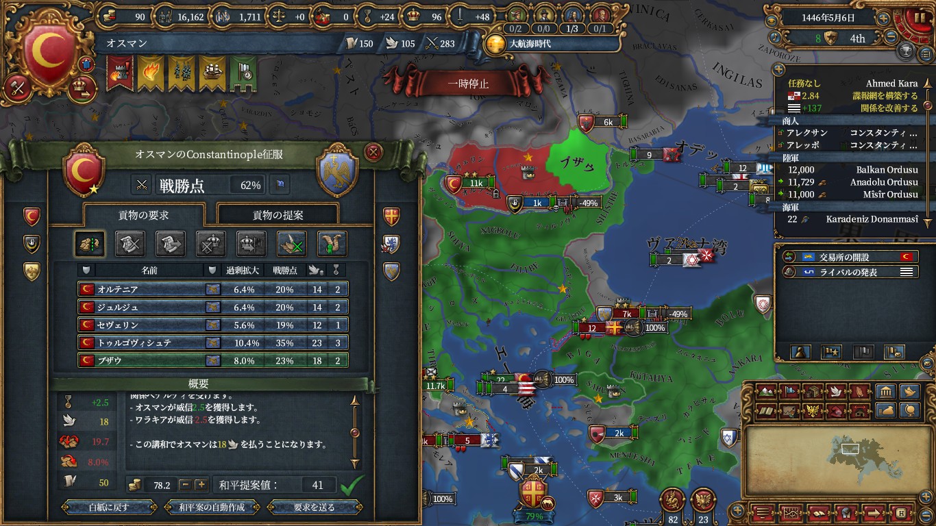 チュニス、クリミア、以下属国化用にアナザ、ドゥルカディル、フェザーン、ヒスンカイファ、グラナダ(トレムセン戦とカスティーリャ戦のAE減)、トレビゾンドと同盟。