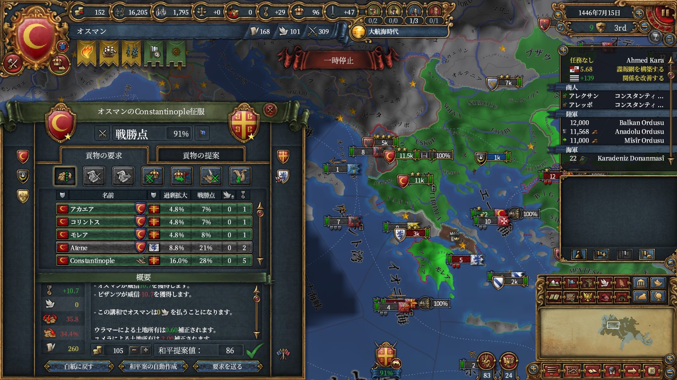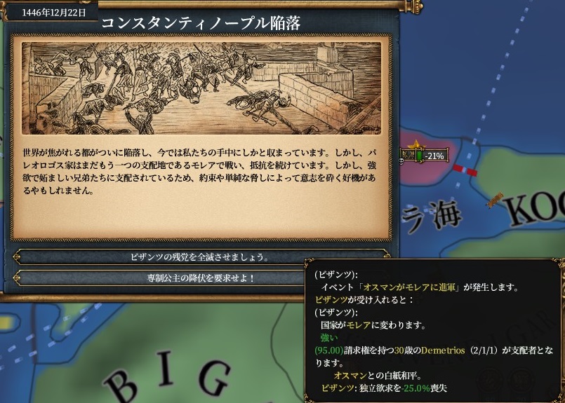 また、コンスタンティノープルを陥落させるとイベントが発生し、モレア以外の州(コンスタ・ブルガス)の譲渡とビザンツがモレアとなって属国にすることを選べます。AEが掛からないのでお得のように見えますが、計30kの僭称者反乱*2が湧くので回避安定です。