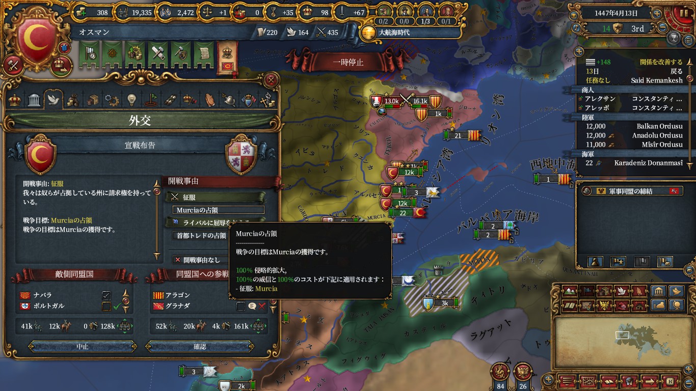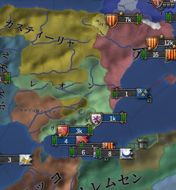 モロッコ(カスティーリャ領を食わせてミッションCBでエヤレトにする)とアラゴン(土地を上げる気はない)と同盟して、二国に土地約束してカスティーリャへと侵攻。